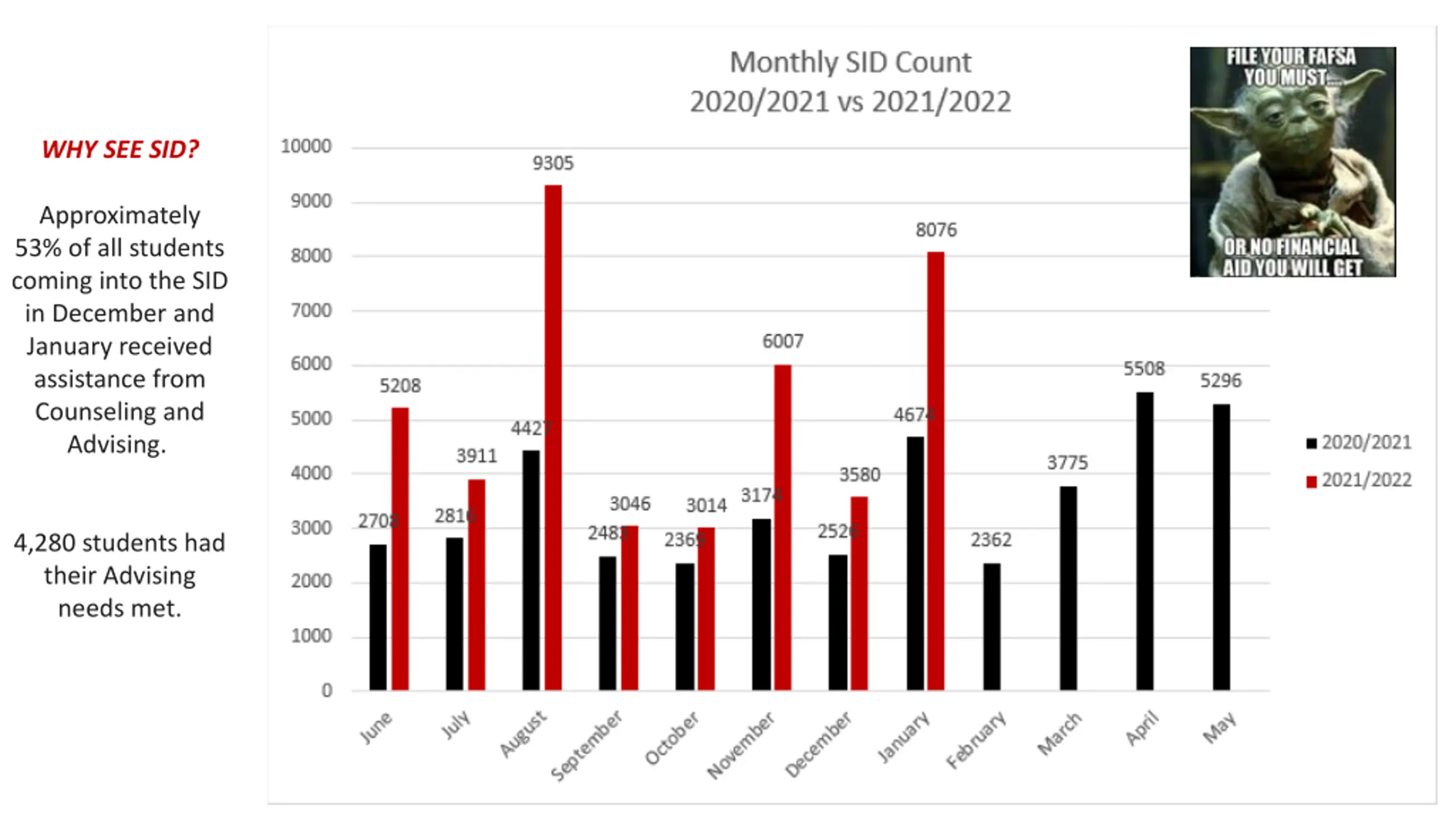 WHY SEE SID? Approximately 53% of all students coming into the SID in December and January received assistance from Counseling and Advising. 4,280 students had their Advising needs met.