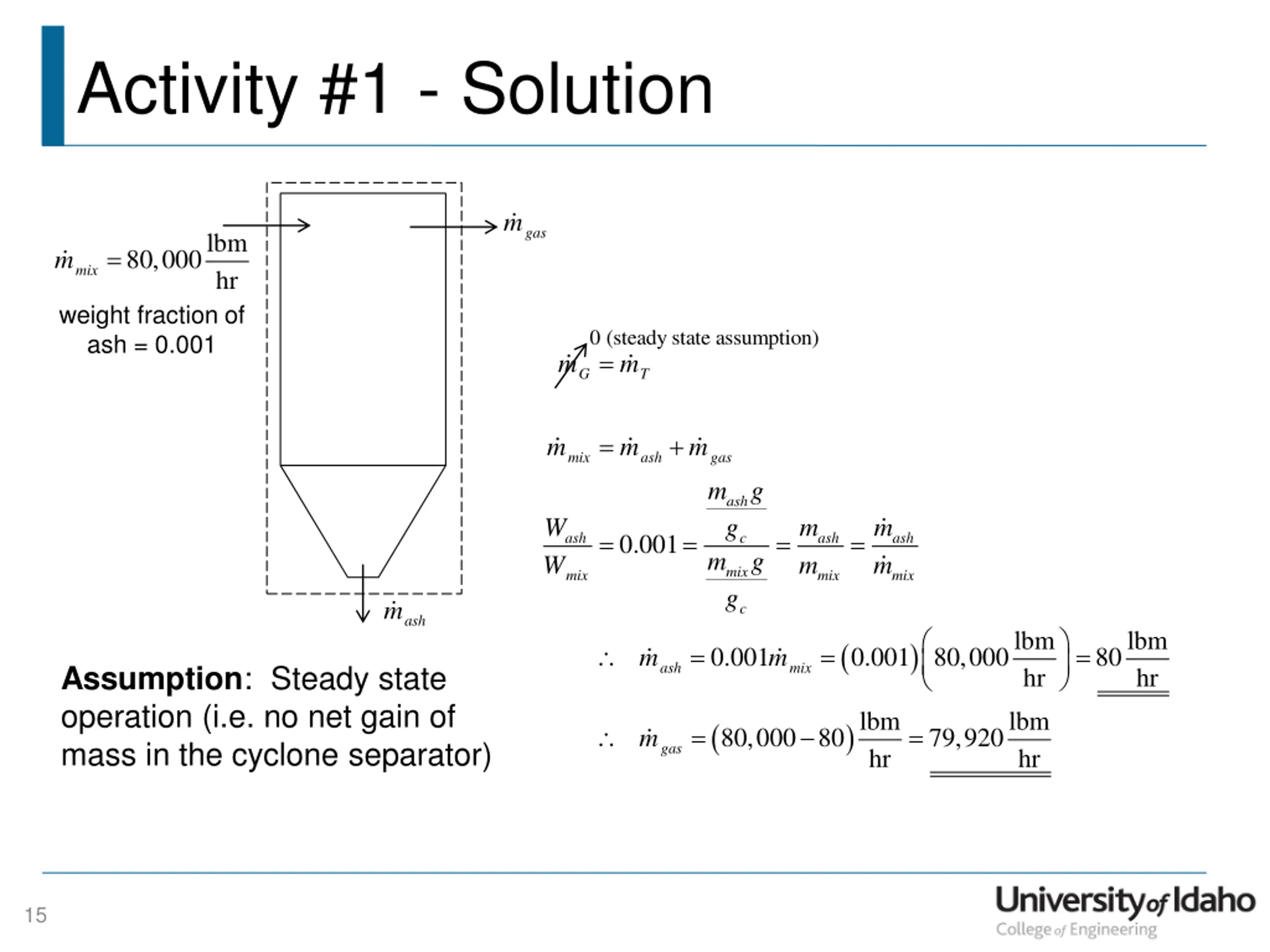 Activity #1 - Solution m gas lbm hr = 80,000 m mix weight fraction of ash = 0.001 0 (steady state assumption) = m m G T = + m m m mix ash gas m g g m g ash W W m m m m = = = = 0.001 ash c ash ash g mix mix mix mix m c ash lbm hr lbm hr ( ) = = = 0.001 0.001 80,000 80 m m ash mix Assumption: Steady state operation (i.e. no net gain of mass in the cyclone separator) lbm hr lbm hr ( ) = = 80,000 80 79,920 m gas 15