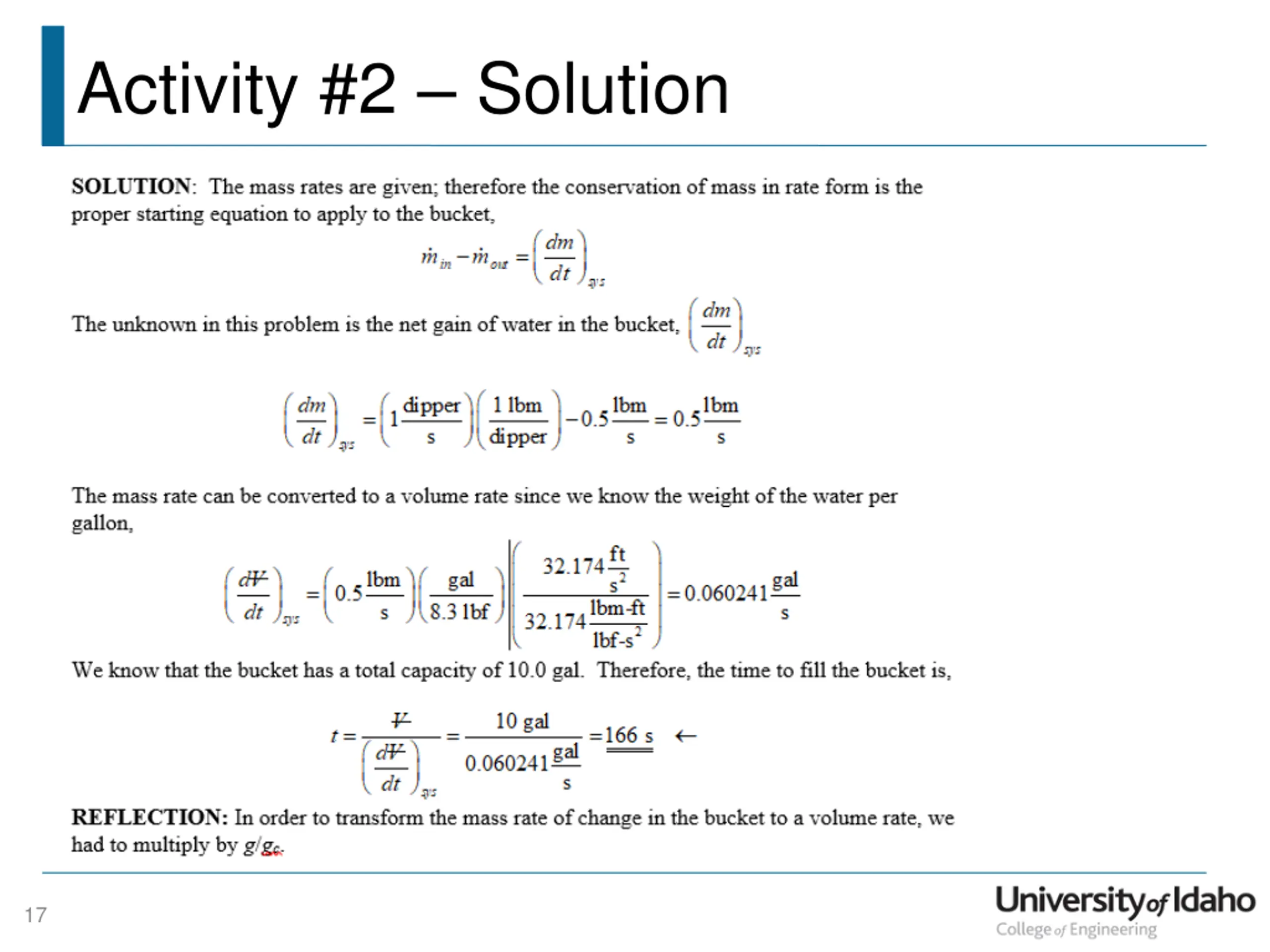 Activity #2 Leaky Bucket GIVEN: A person is trying to fill a 10.0 gal bucket by hand with a dipper. dipper s 1 dipper holds 1 lbm of water 1 lbf gal water weighs 8.3 at sea level lbm s = 0.5 m out FIND: How long does it take to fill the bucket with water? 16
