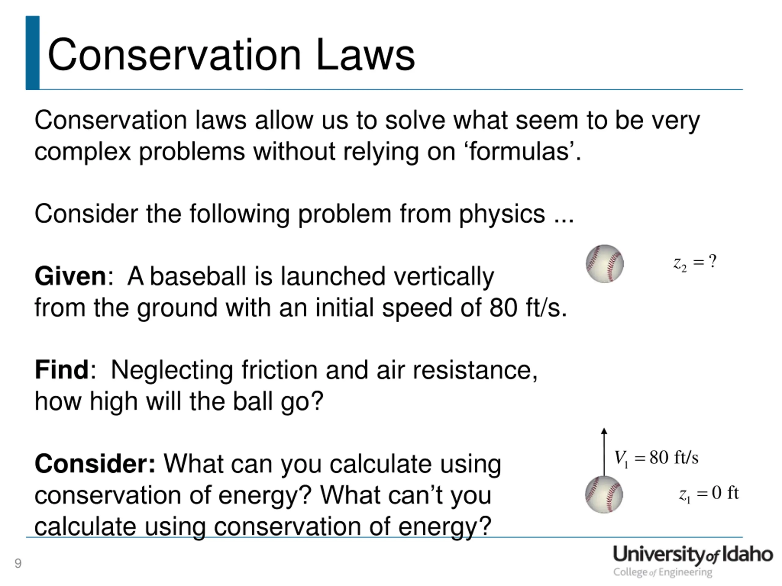Conservation Laws Conservation laws allow us to solve what seem to be very complex problems without relying on formulas . Consider the following problem from physics ... z = ? Given: A baseball is launched vertically from the ground with an initial speed of 80 ft/s. 2 Find: Neglecting friction and air resistance, how high will the ball go? V = 80 ft/s Consider: What can you calculate using conservation of energy? What can t you calculate using conservation of energy? 1 z = 0 ft 1 9