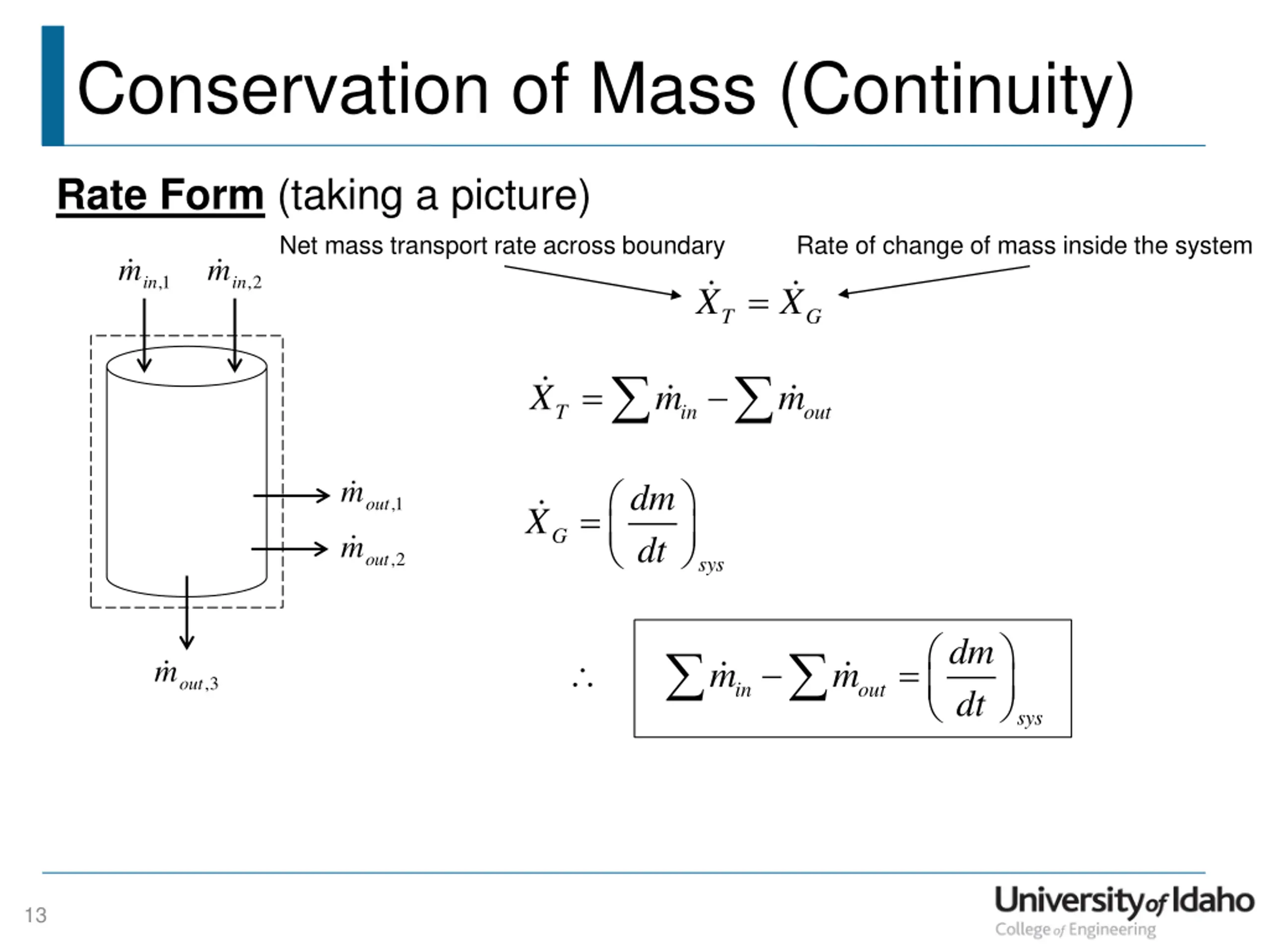 Conservation of Mass (Continuity) Rate Form (taking a picture) Net mass transport rate across boundary Rate of change of mass inside the system m m ,1 ,2 in in = X X T G = X m m T in out m dm dt ,1 out = X G m ,2 out sys dm dt = m m m ,3 out in out sys 13
