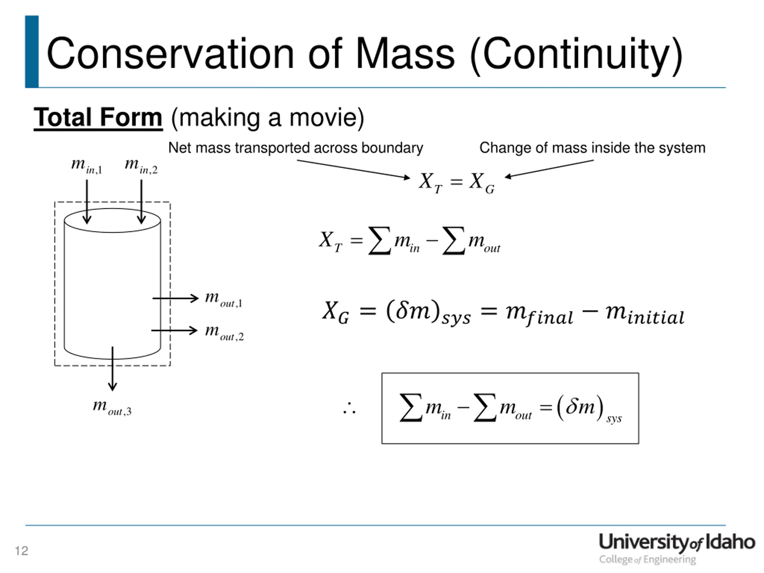 Conservation of Mass (Continuity) Total Form (making a movie) Net mass transported across boundary Change of mass inside the system m m ,1 ,2 in in = X X T G = X m m T in out m ,1 out ??= ?????= ?????? ???????? m ,2 out ( ) = m m m m ,3 out in out sys 12