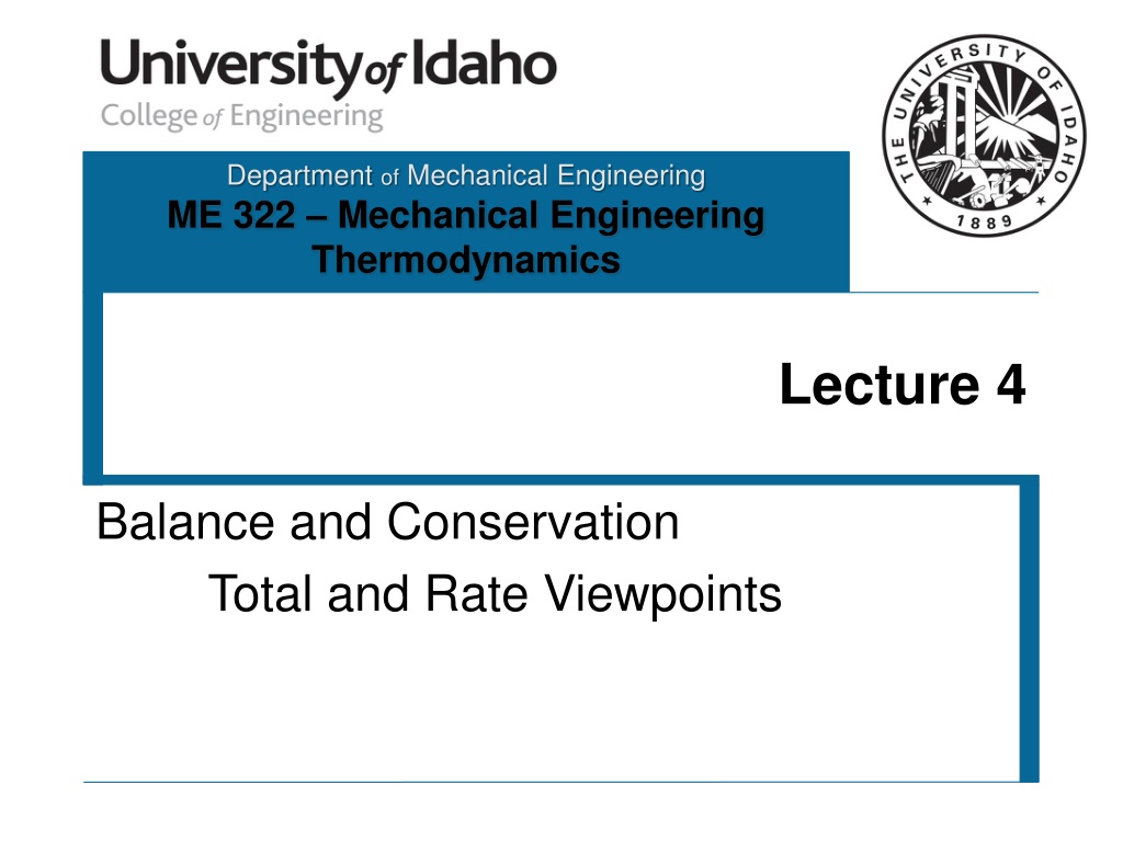 Department of Mechanical Engineering ME 322 Mechanical Engineering Thermodynamics Lecture 4 Balance and Conservation Total and Rate Viewpoints