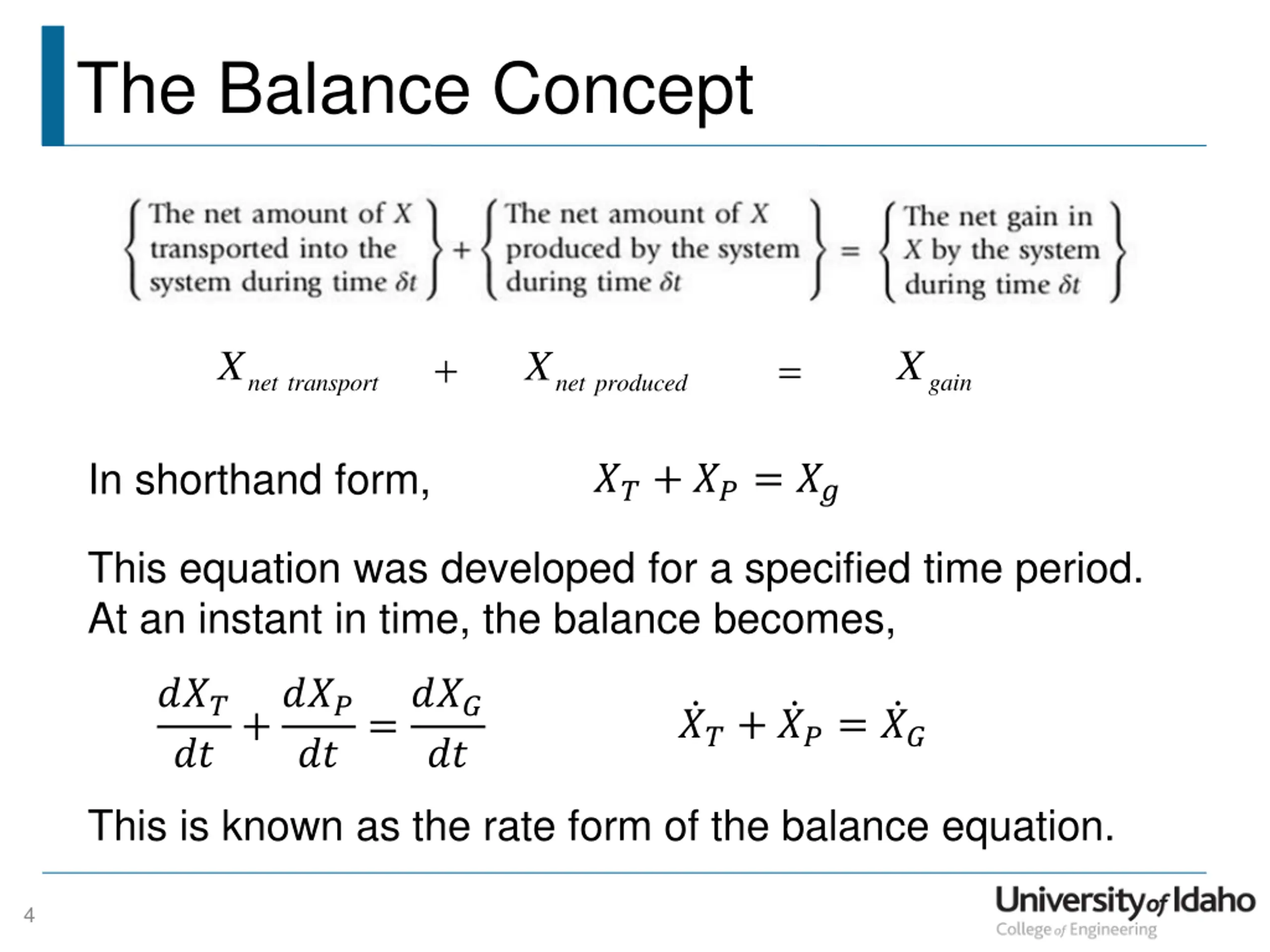 The Balance Concept + X X X = gain net transport net produced In shorthand form, ??+ ??= ?? This equation was developed for a specified time period. At an instant in time, the balance becomes, ??? ?? +??? =??? ??+ ??= ?? ?? ?? This is known as the rate form of the balance equation. 4