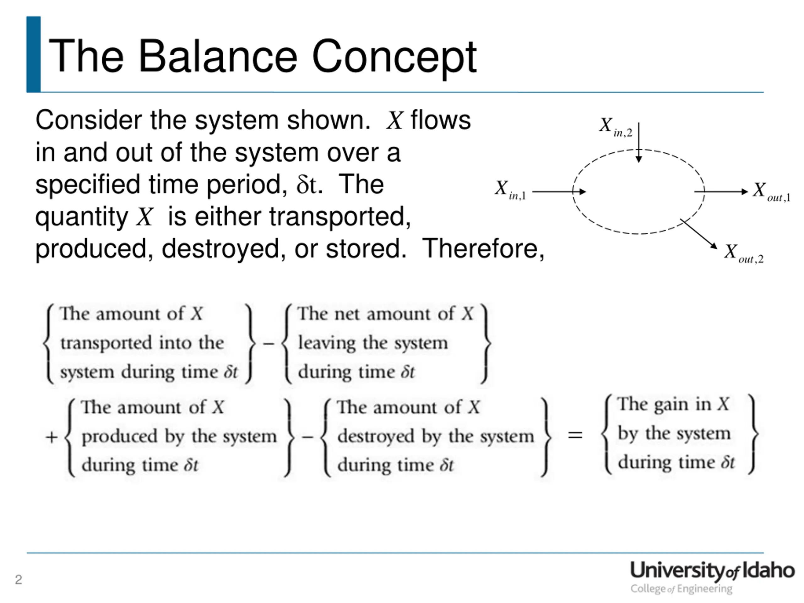The Balance Concept Consider the system shown. X flows in and out of the system over a specified time period, t. The quantity X is either transported, produced, destroyed, or stored. Therefore, X ,2 in X X ,1 in ,1 out X ,2 out = 2