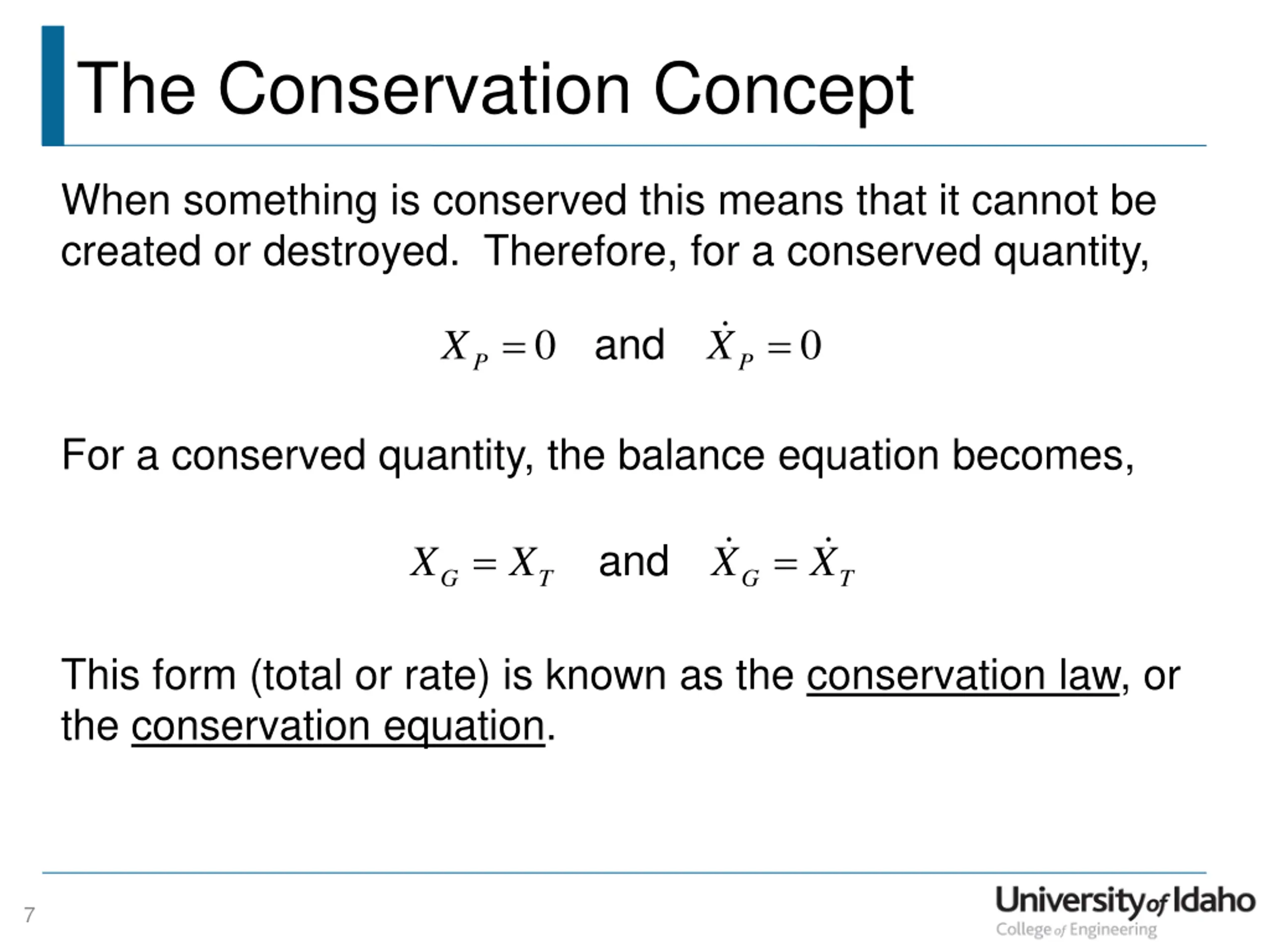 The Conservation Concept When something is conserved this means that it cannot be created or destroyed. Therefore, for a conserved quantity, = = and 0 0 X X P P For a conserved quantity, the balance equation becomes, = = and X X X X G T G T This form (total or rate) is known as the conservation law, or the conservation equation. 7