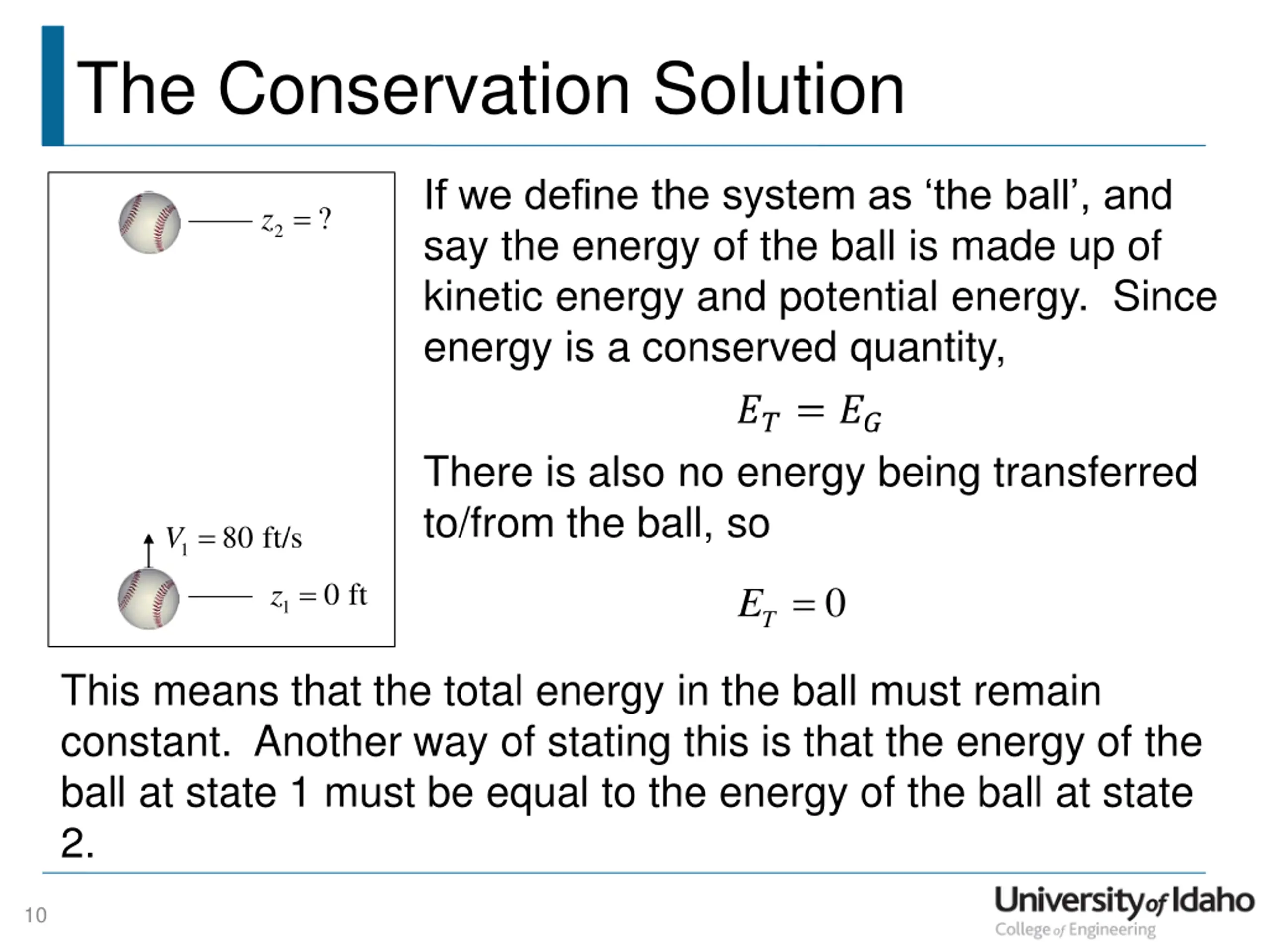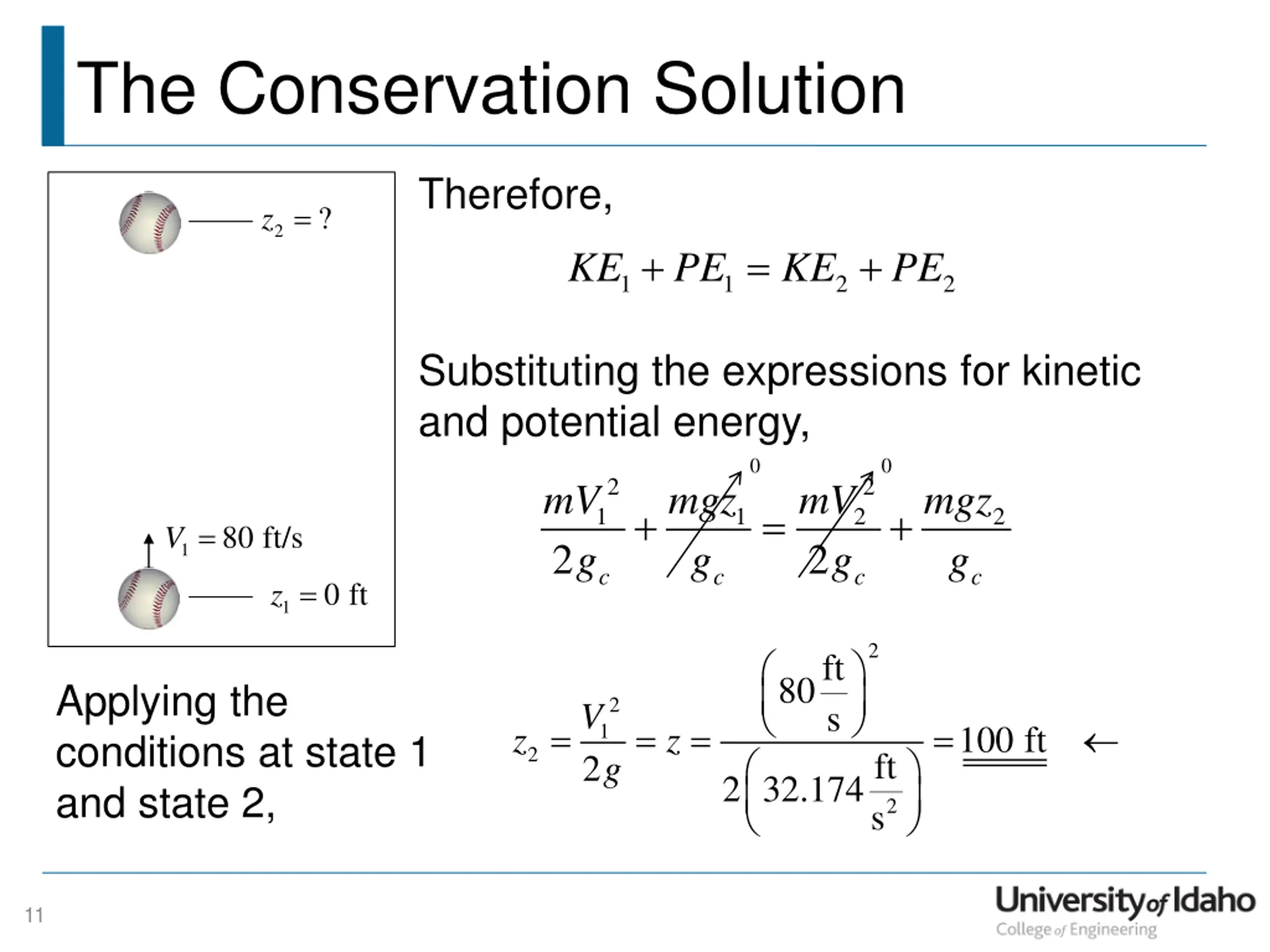 The Conservation Solution If we define the system as the ball , and say the energy of the ball is made up of kinetic energy and potential energy. Since energy is a conserved quantity, ??= ?? z = ? 2 There is also no energy being transferred to/from the ball, so V = 80 ft/s 1 z = E = 0 ft 0 1 T This means that the total energy in the ball must remain constant. Another way of stating this is that the energy of the ball at state 1 must be equal to the energy of the ball at state 2. 10