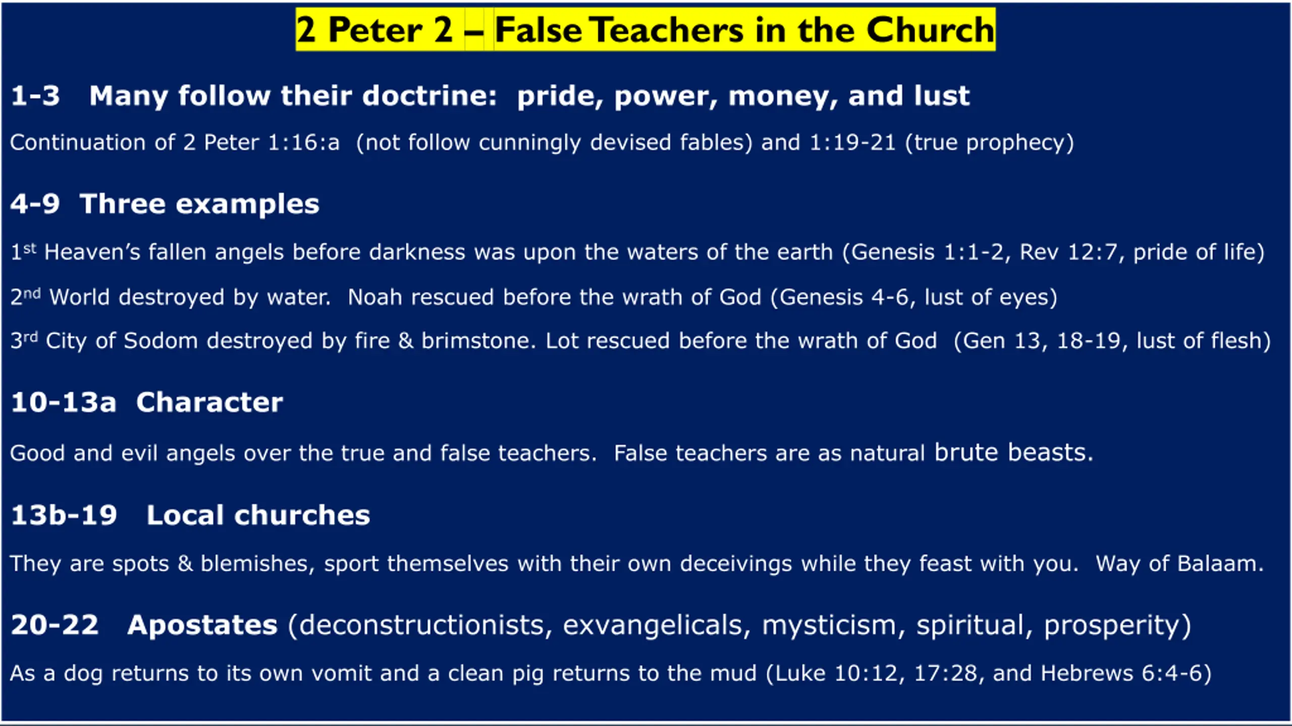 2 Peter 2 False Teachers in the Church 1-3 Many follow their doctrine: pride, power, money, and lust Continuation of 2 Peter 1:16:a (not follow cunningly devised fables) and 1:19-21 (true prophecy) 4-9 Three examples 1stHeaven s fallen angels before darkness was upon the waters of the earth (Genesis 1:1-2, Rev 12:7, pride of life) 2nd World destroyed by water. Noah rescued before the wrath of God (Genesis 4-6, lust of eyes) 3rd City of Sodom destroyed by fire & brimstone. Lot rescued before the wrath of God (Gen 13, 18-19, lust of flesh) 10-13a Character Good and evil angels over the true and false teachers. False teachers are as natural brute beasts. 13b-19 Local churches They are spots & blemishes, sport themselves with their own deceivings while they feast with you. Way of Balaam. 20-22 Apostates (deconstructionists, exvangelicals, mysticism, spiritual, prosperity) As a dog returns to its own vomit and a clean pig returns to the mud (Luke 10:12, 17:28, and Hebrews 6:4-6)