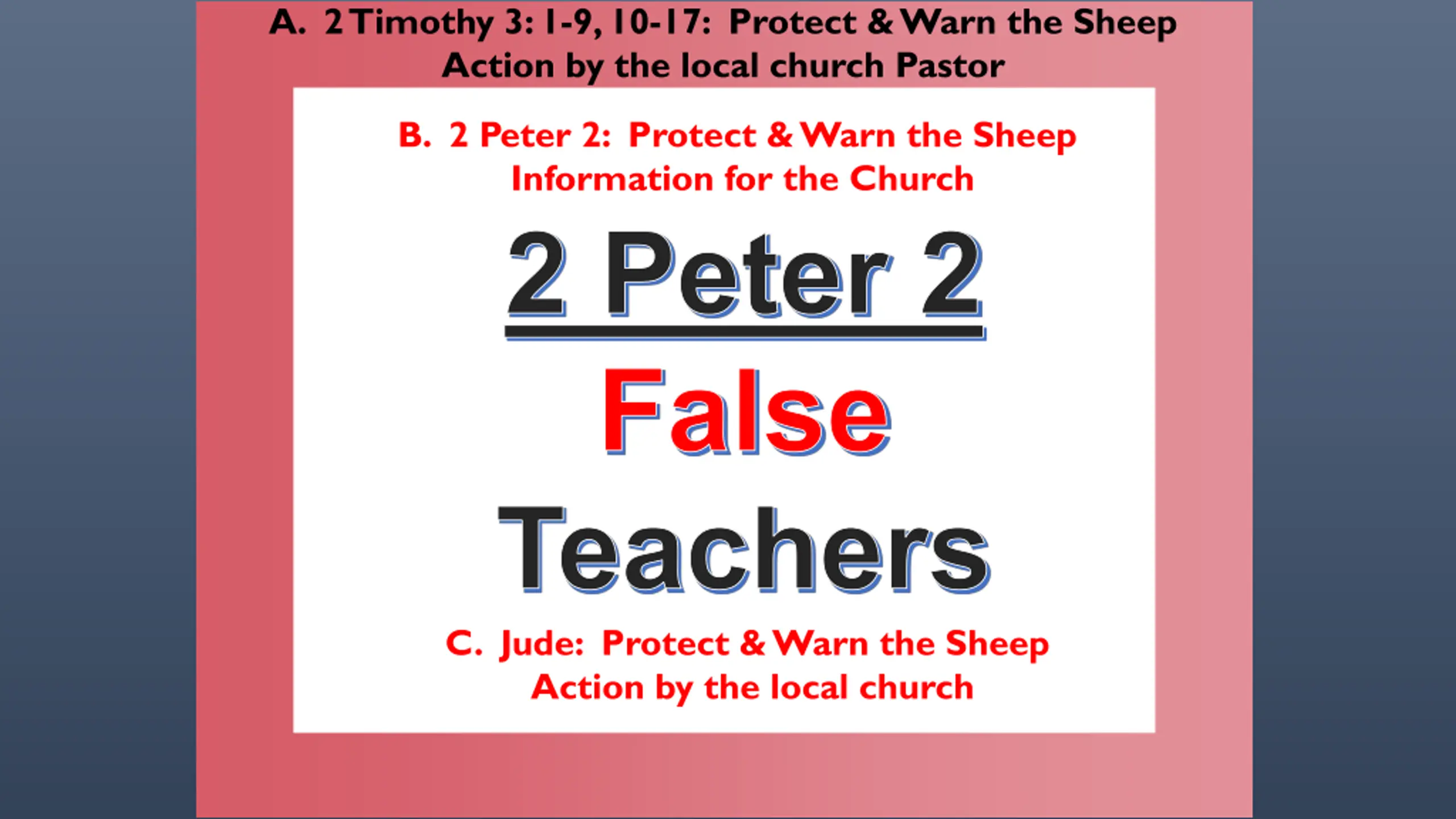 A. 2 Timothy 3: 1-9, 10-17: Protect & Warn the Sheep Action by the local church Pastor B. 2 Peter 2: Protect & Warn the Sheep Information for the Church C. Jude: Protect & Warn the Sheep Action by the local church