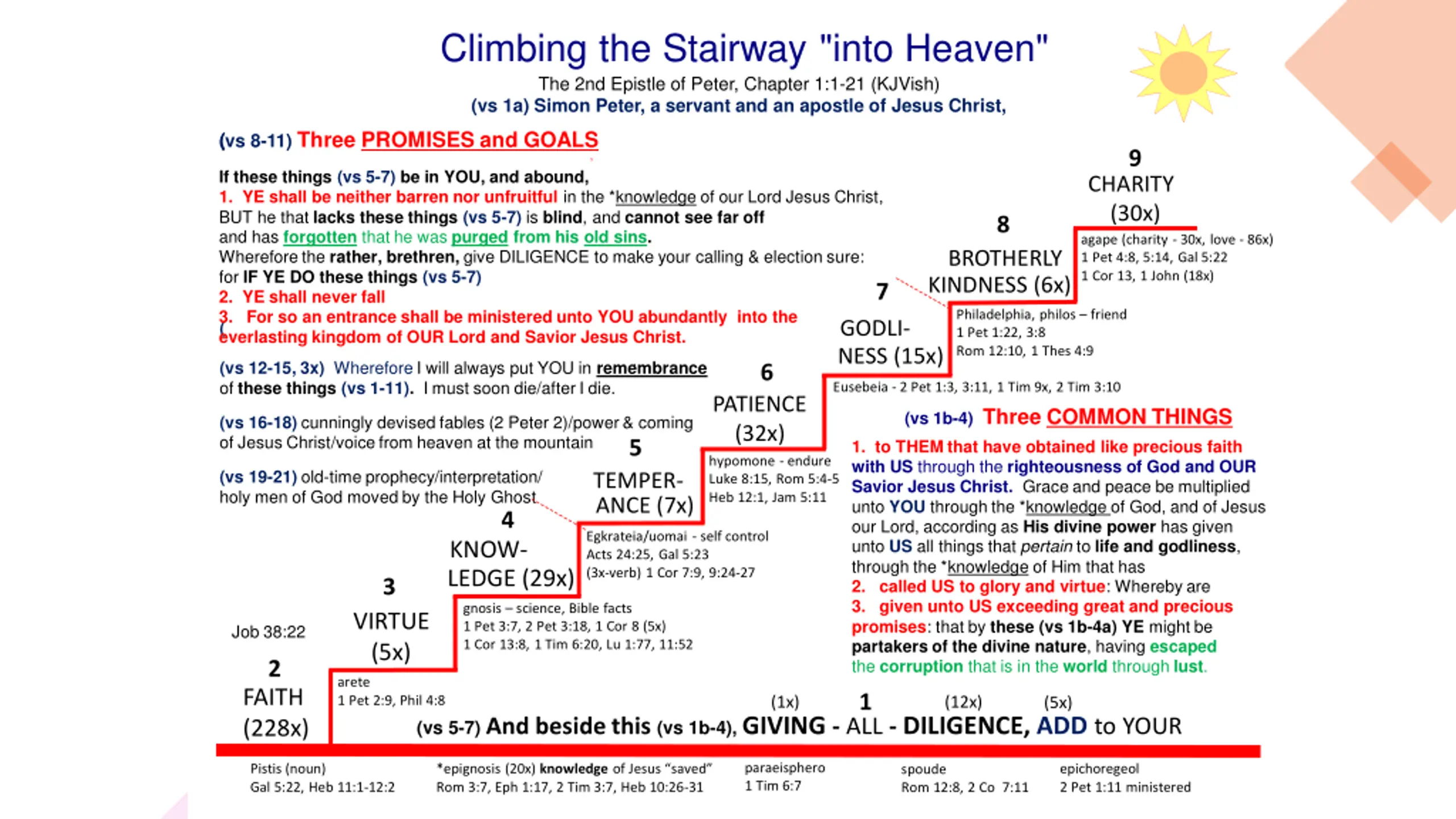Climbing the Stairway "into Heaven" The 2nd Epistle of Peter, Chapter 1:1-21 (KJVish) (vs 1a) Simon Peter, a servant and an apostle of Jesus Christ, ( (vs 8-11) Three PROMISES and GOALS 9 , If these things (vs 5-7) be in YOU, and abound, 1. YE shall be neither barren nor unfruitful in the *knowledge of our Lord Jesus Christ, BUT he that lacks these things (vs 5-7) is blind, and cannot see far off and has forgotten that he was purged from his old sins. Wherefore the rather, brethren, give DILIGENCE to make your calling & election sure: for IF YE DO these things (vs 5-7) 2. YE shall never fall 3. For so an entrance shall be ministered unto YOU abundantly into the CHARITY (30x) agape (charity - 30x, love - 86x) 1 Pet 4:8, 5:14, Gal 5:22 1 Cor 13, 1 John (18x) 8 BROTHERLY KINDNESS (6x) 7 Philadelphia, philos friend 1 Pet 1:22, 3:8 Rom 12:10, 1 Thes 4:9 GODLI- NESS (15x) ( everlasting kingdom of OUR Lord and Savior Jesus Christ. . (vs 12-15, 3x) Wherefore I will always put YOU in remembrance of these things (vs 1-11). I must soon die/after I die. 6 Eusebeia - 2 Pet 1:3, 3:11, 1 Tim 9x, 2 Tim 3:10 PATIENCE (32x) (vs 1b-4) Three COMMON THINGS 1. to THEM that have obtained like precious faith with US through the righteousness of God and OUR Savior Jesus Christ. Grace and peace be multiplied unto YOU through the *knowledge of God, and of Jesus our Lord, according as His divine power has given unto US all things that pertain to life and godliness, through the *knowledge of Him that has 2. called US to glory and virtue: Whereby are 3. given unto US exceeding great and precious promises: that by these (vs 1b-4a) YE might be partakers of the divine nature, having escaped the corruption that is in the world through lust. (vs 16-18) cunningly devised fables (2 Peter 2)/power & coming of Jesus Christ/voice from heaven at the mountain 5 hypomone - endure Luke 8:15, Rom 5:4-5 Heb 12:1, Jam 5:11 (vs 19-21) old-time prophecy/interpretation/ holy men of God moved by the Holy Ghost TEMPER- ANCE (7x) 4 Egkrateia/uomai - self control Acts 24:25, Gal 5:23 (3x-verb) 1 Cor 7:9, 9:24-27 KNOW- LEDGE (29x) 3 gnosis science, Bible facts 1 Pet 3:7, 2 Pet 3:18, 1 Cor 8 (5x) 1 Cor 13:8, 1 Tim 6:20, Lu 1:77, 11:52 VIRTUE (5x) Job 38:22 2 arete 1 Pet 2:9, Phil 4:8 FAITH (228x) 1 (12x) (1x) (5x) (vs 5-7) And beside this (vs 1b-4), GIVING - ALL - DILIGENCE, ADD to YOUR paraeisphero 1 Tim 6:7 Pistis (noun) Gal 5:22, Heb 11:1-12:2 *epignosis (20x) knowledge of Jesus saved Rom 3:7, Eph 1:17, 2 Tim 3:7, Heb 10:26-31 epichoregeol 2 Pet 1:11 ministered spoude Rom 12:8, 2 Co 7:11