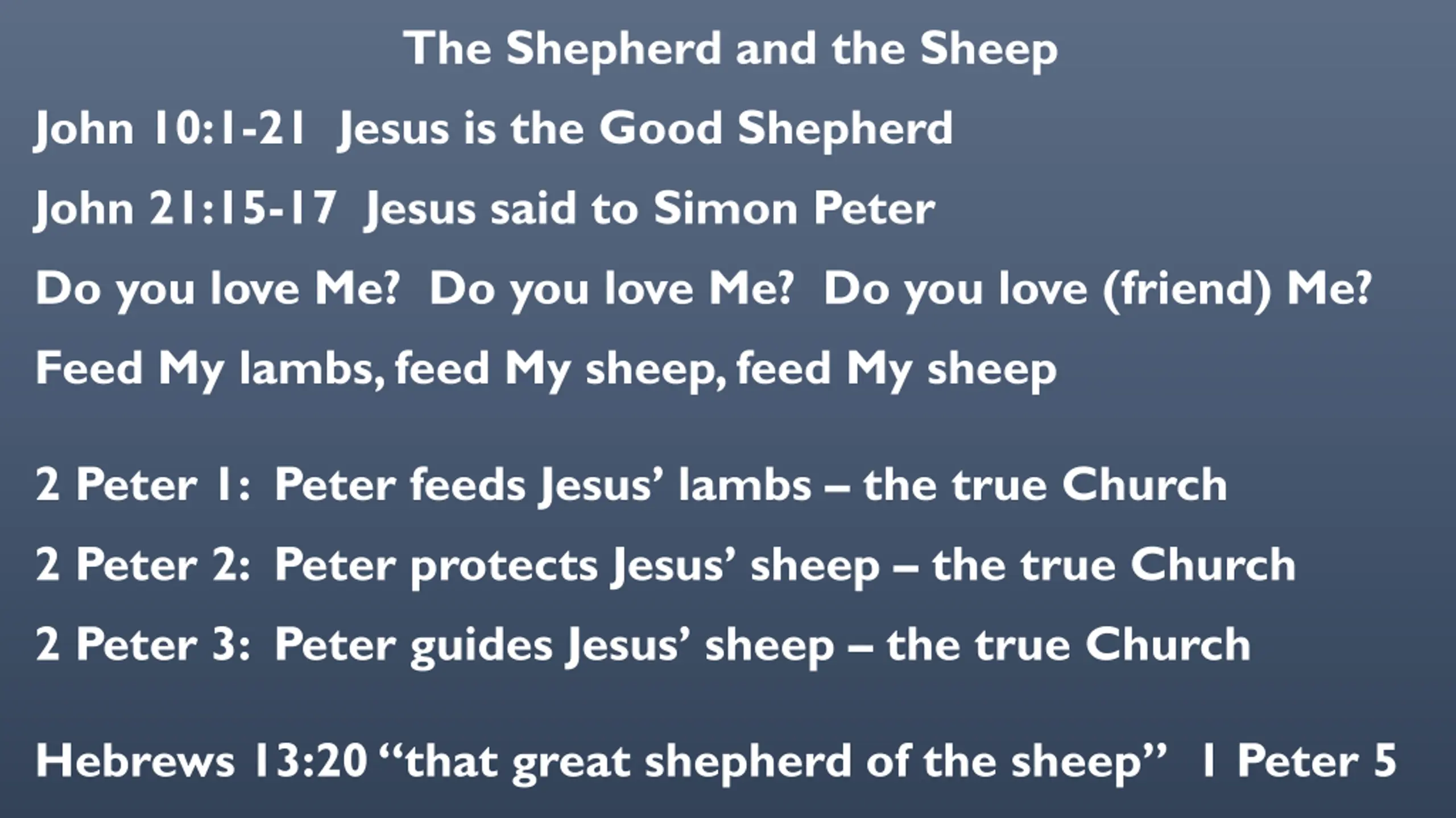 The Shepherd and the Sheep John 10:1-21 Jesus is the Good Shepherd John 21:15-17 Jesus said to Simon Peter Do you love Me? Do you love Me? Do you love (friend) Me? Feed My lambs, feed My sheep, feed My sheep 2 Peter 1: Peter feeds Jesus lambs the true Church 2 Peter 2: Peter protects Jesus sheep the true Church 2 Peter 3: Peter guides Jesus sheep the true Church Hebrews 13:20 that great shepherd of the sheep 1 Peter 5