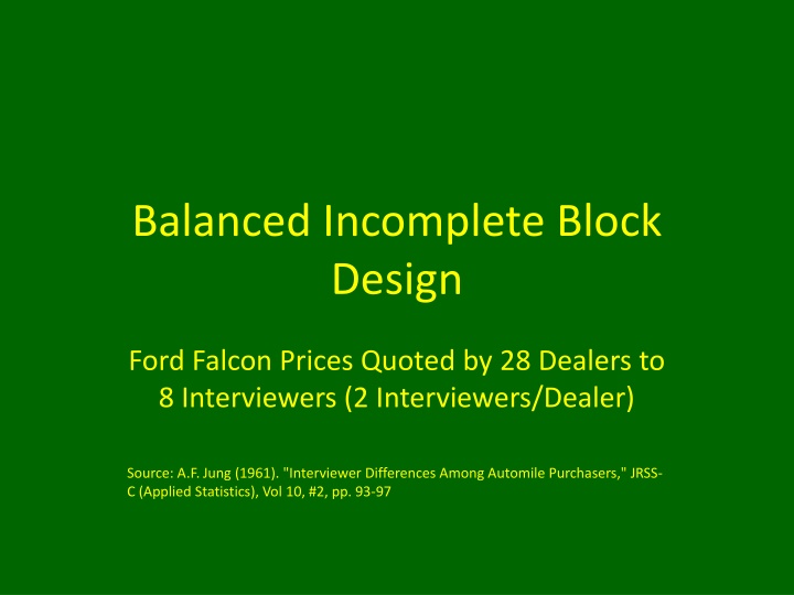 Balanced Incomplete Block Design Ford Falcon Prices Quoted by 28 Dealers to 8 Interviewers (2 Interviewers/Dealer) Source: A.F. Jung (1961). "Interviewer Differences Among Automile Purchasers," JRSS- C (Applied Statistics), Vol 10, #2, pp. 93-97