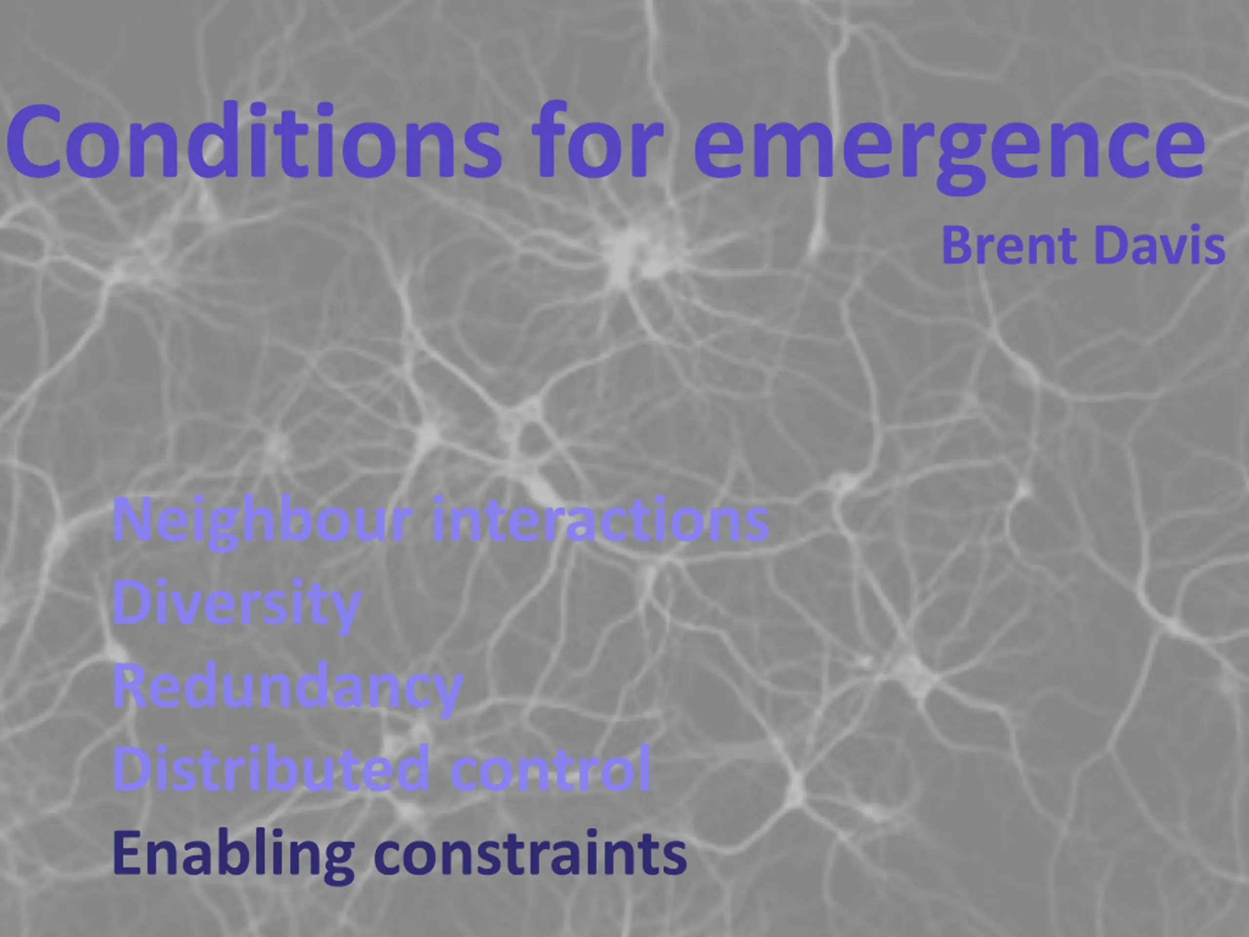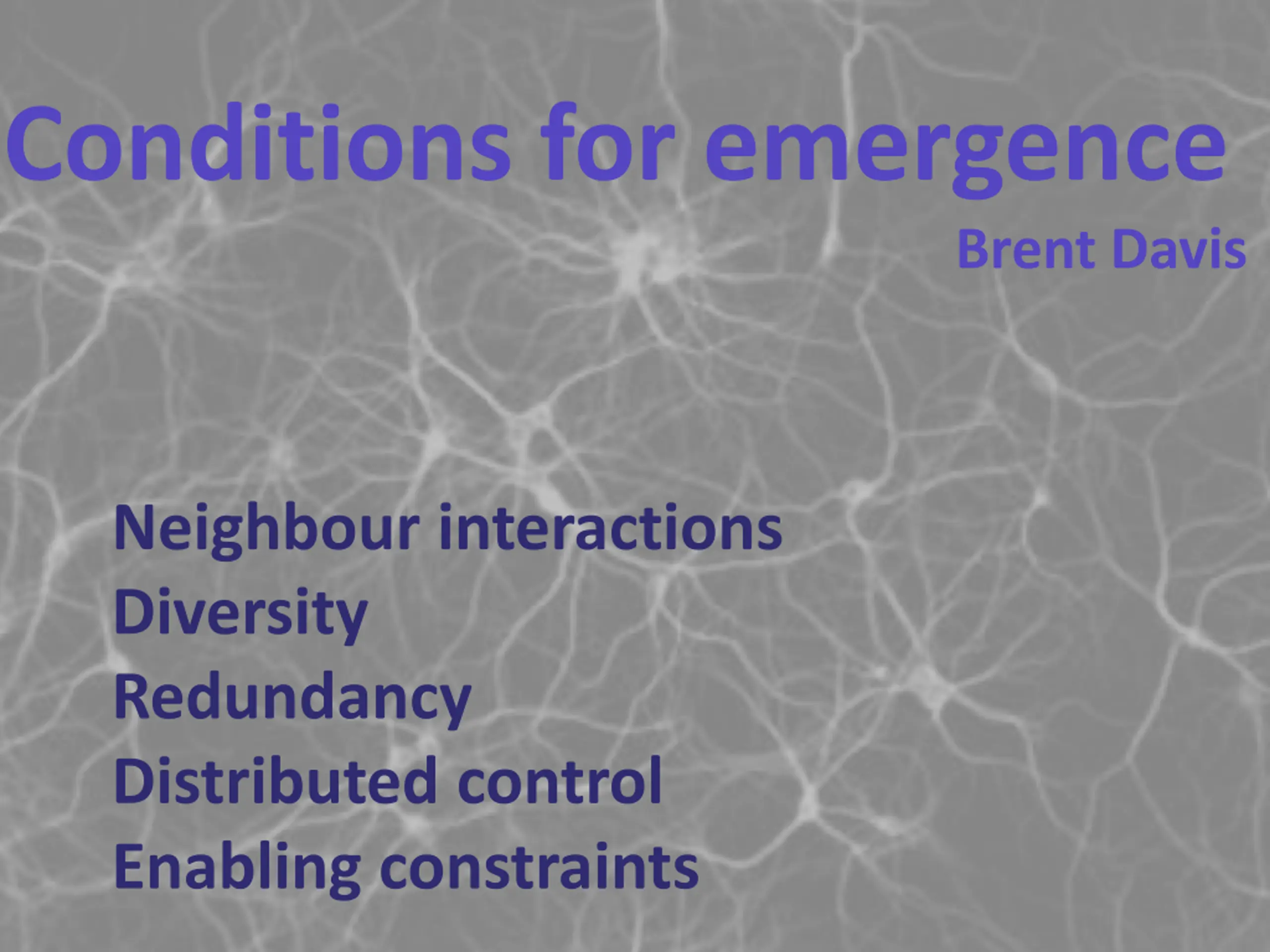 - Conditions for emergence Brent Davis Neighbour interactions Diversity Redundancy Distributed control Enabling constraints