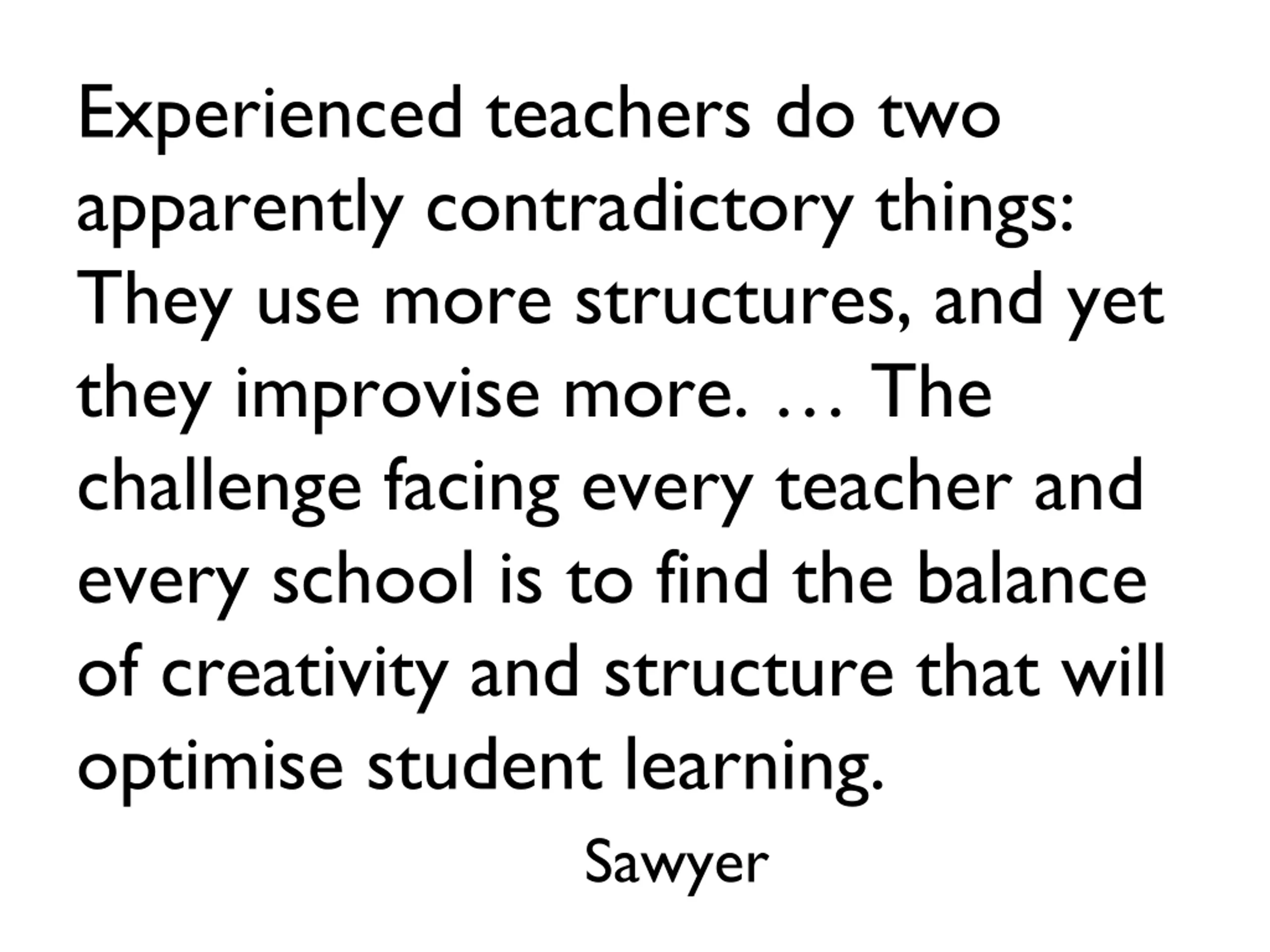 - Experienced teachers do two apparently contradictory things: They use more structures, and yet they improvise more. The challenge facing every teacher and every school is to find the balance of creativity and structure that will optimise student learning. Sawyer