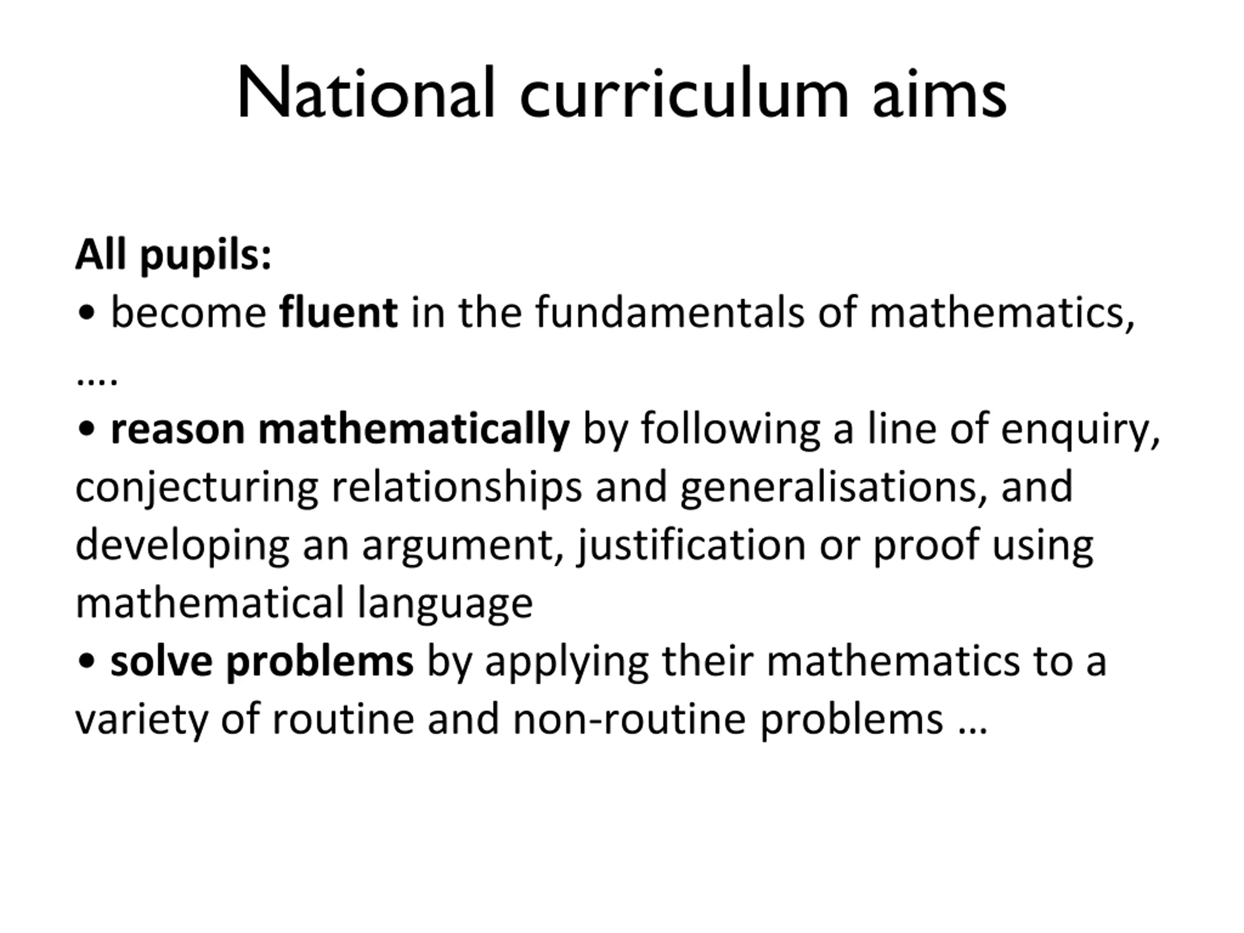 - National curriculum aims All pupils: become fluent in the fundamentals of mathematics, . reason mathematically by following a line of enquiry, conjecturing relationships and generalisations, and developing an argument, justification or proof using mathematical language solve problems by applying their mathematics to a variety of routine and non-routine problems