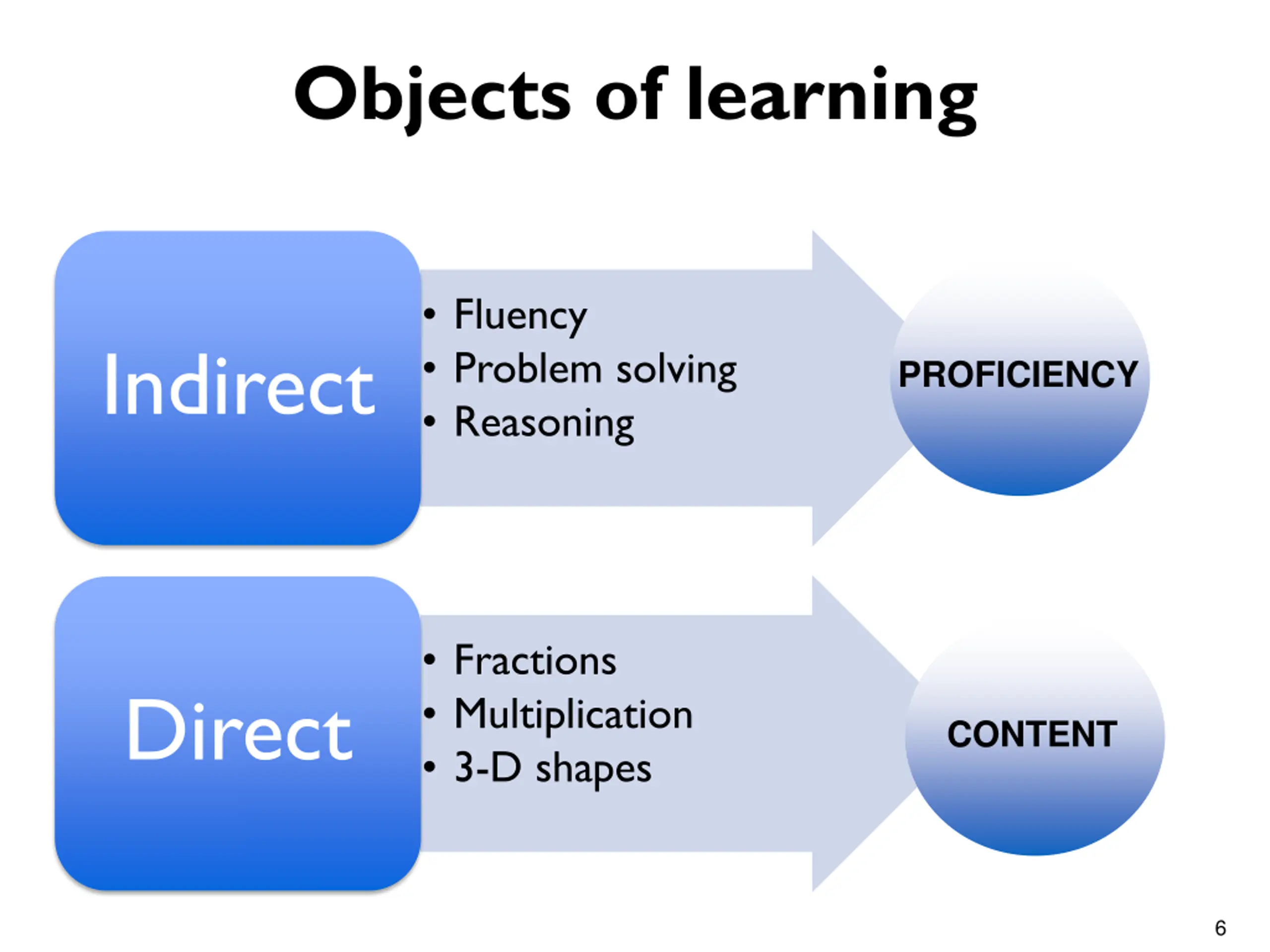 - Objects of learning Fluency Problem solving Reasoning Indirect PROFICIENCY Fractions Multiplication 3-D shapes Direct CONTENT 6