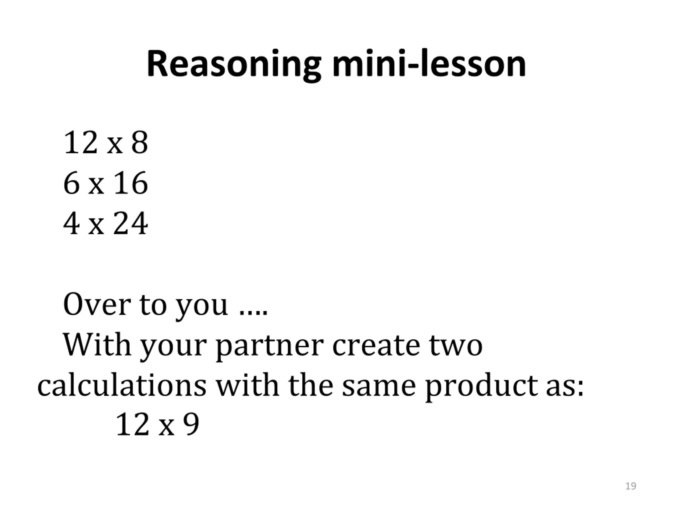 - Reasoning mini-lesson 12 x 8 6 x 16 4 x 24 Over to you . With your partner create two calculations with the same product as: 12 x 9 19