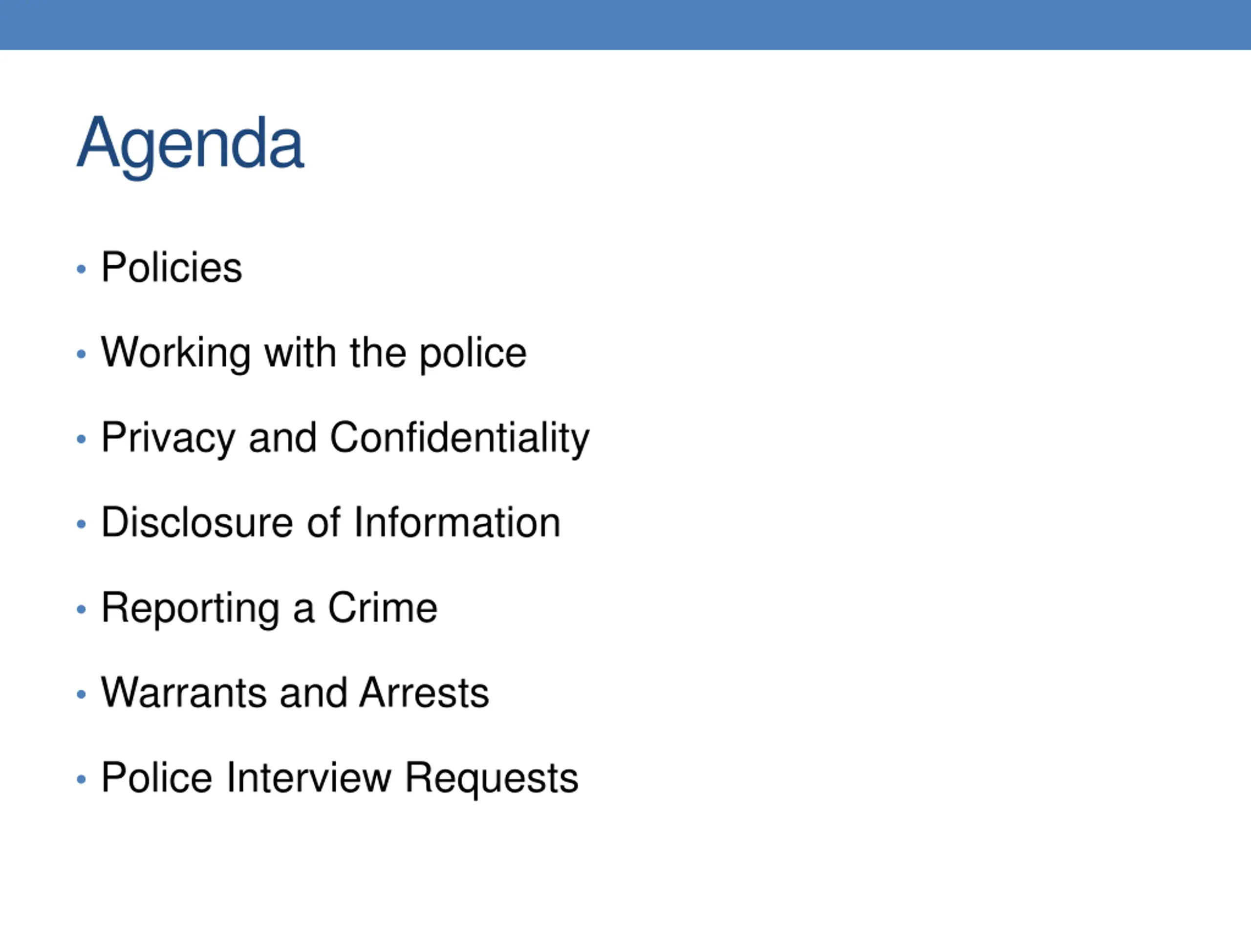 Agenda Policies Working with the police Privacy and Confidentiality Disclosure of Information Reporting a Crime Warrants and Arrests Police Interview Requests