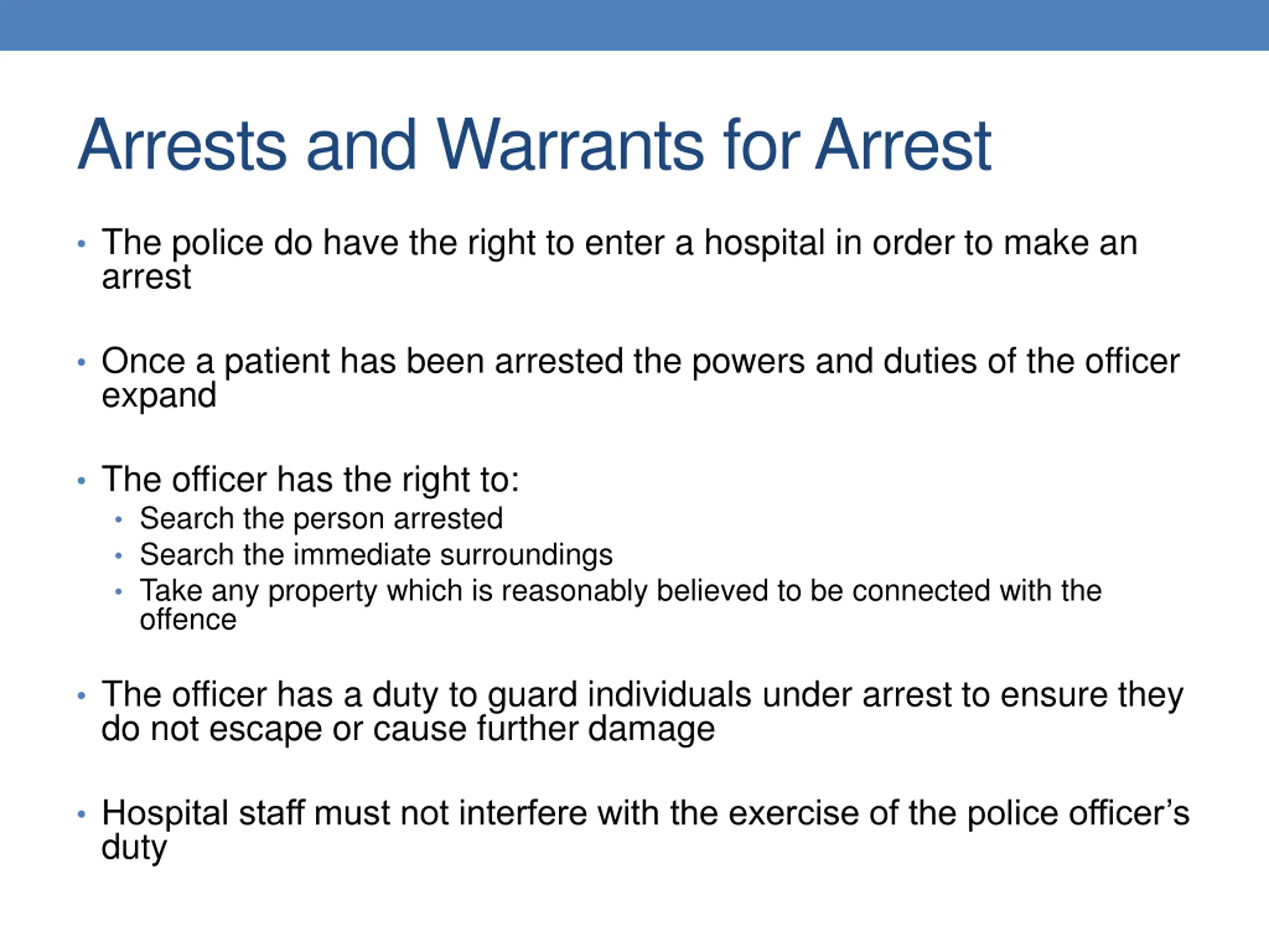 Arrests and Warrants for Arrest The police do have the right to enter a hospital in order to make an arrest Once a patient has been arrested the powers and duties of the officer expand The officer has the right to: Search the person arrested Search the immediate surroundings Take any property which is reasonably believed to be connected with the offence The officer has a duty to guard individuals under arrest to ensure they do not escape or cause further damage Hospital staff must not interfere with the exercise of the police officer s duty