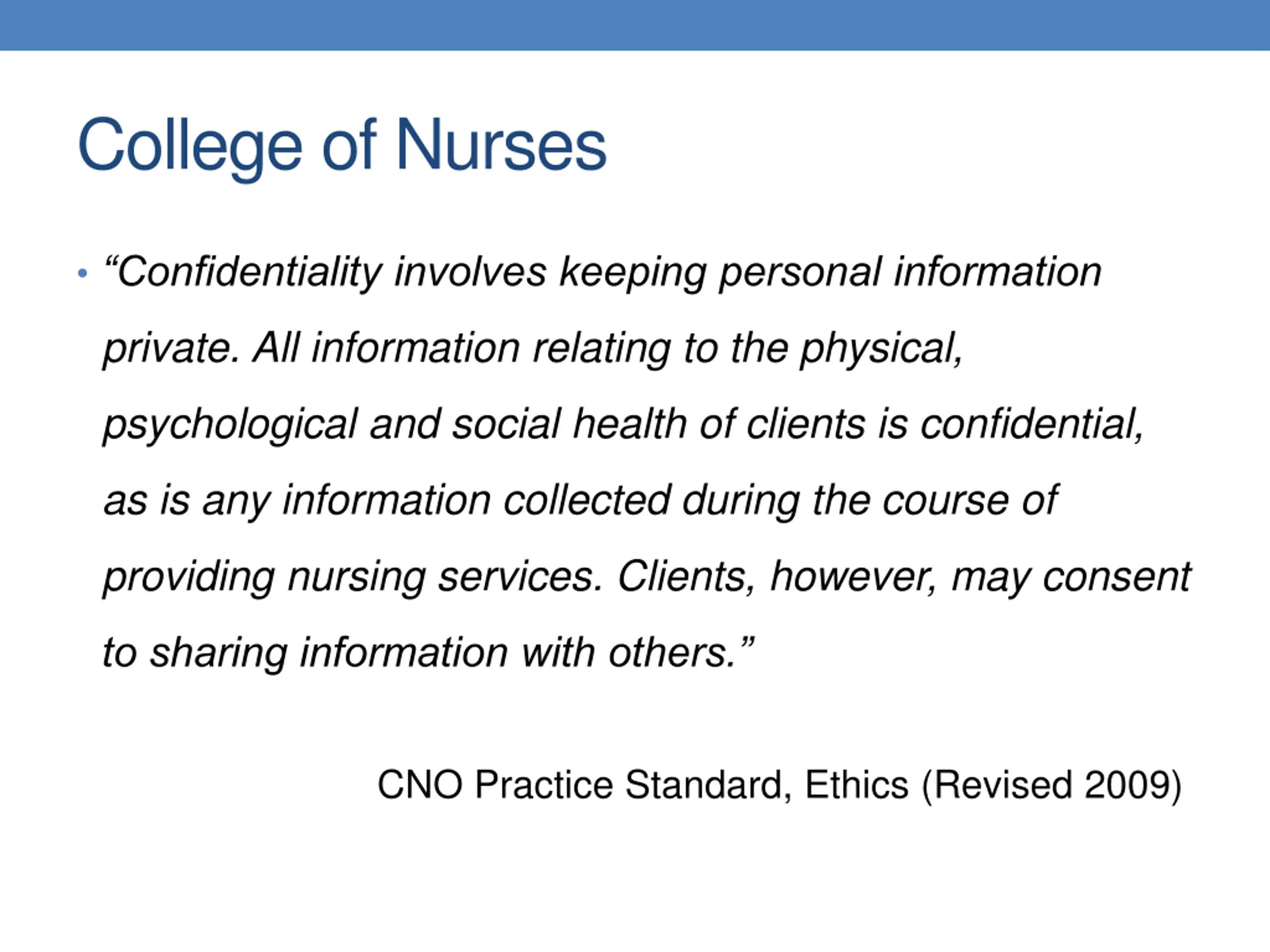 College of Nurses Confidentiality involves keeping personal information private. All information relating to the physical, psychological and social health of clients is confidential, as is any information collected during the course of providing nursing services. Clients, however, may consent to sharing information with others. CNO Practice Standard, Ethics (Revised 2009)