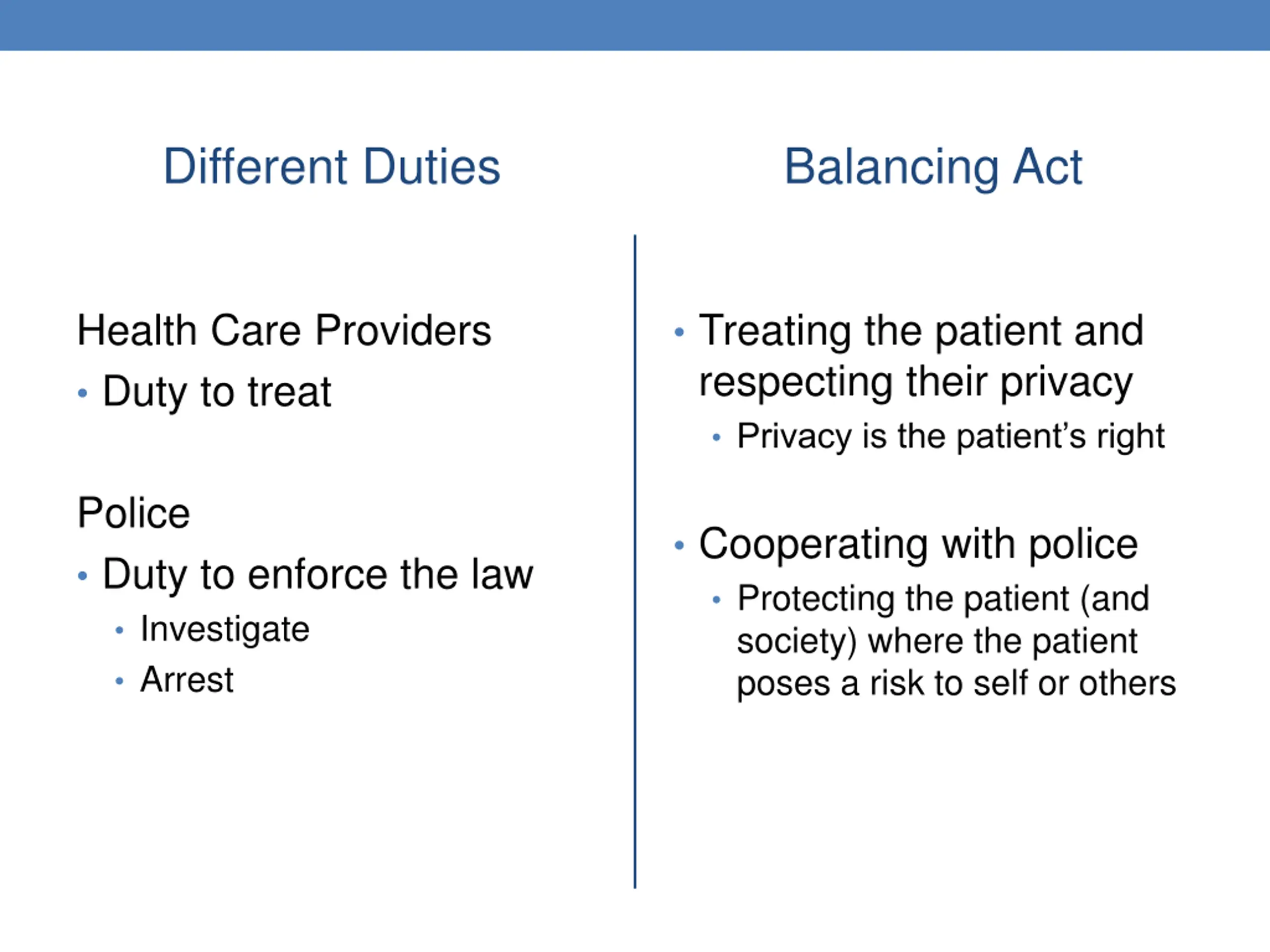 Different Duties Balancing Act Health Care Providers Duty to treat Treating the patient and respecting their privacy Privacy is the patient s right Police Duty to enforce the law Investigate Arrest Cooperating with police Protecting the patient (and society) where the patient poses a risk to self or others