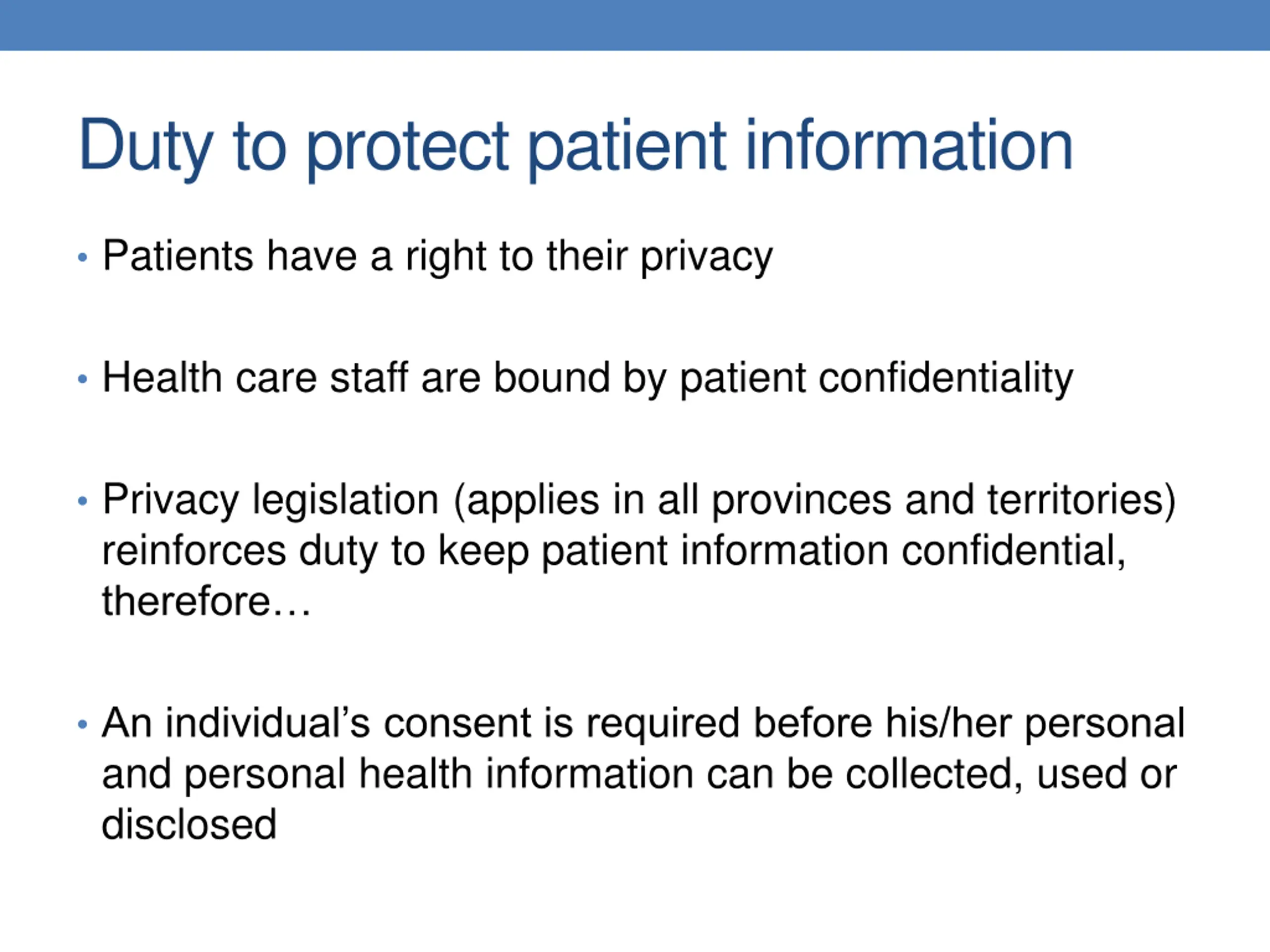 Duty to protect patient information Patients have a right to their privacy Health care staff are bound by patient confidentiality Privacy legislation (applies in all provinces and territories) reinforces duty to keep patient information confidential, therefore An individual s consent is required before his/her personal and personal health information can be collected, used or disclosed