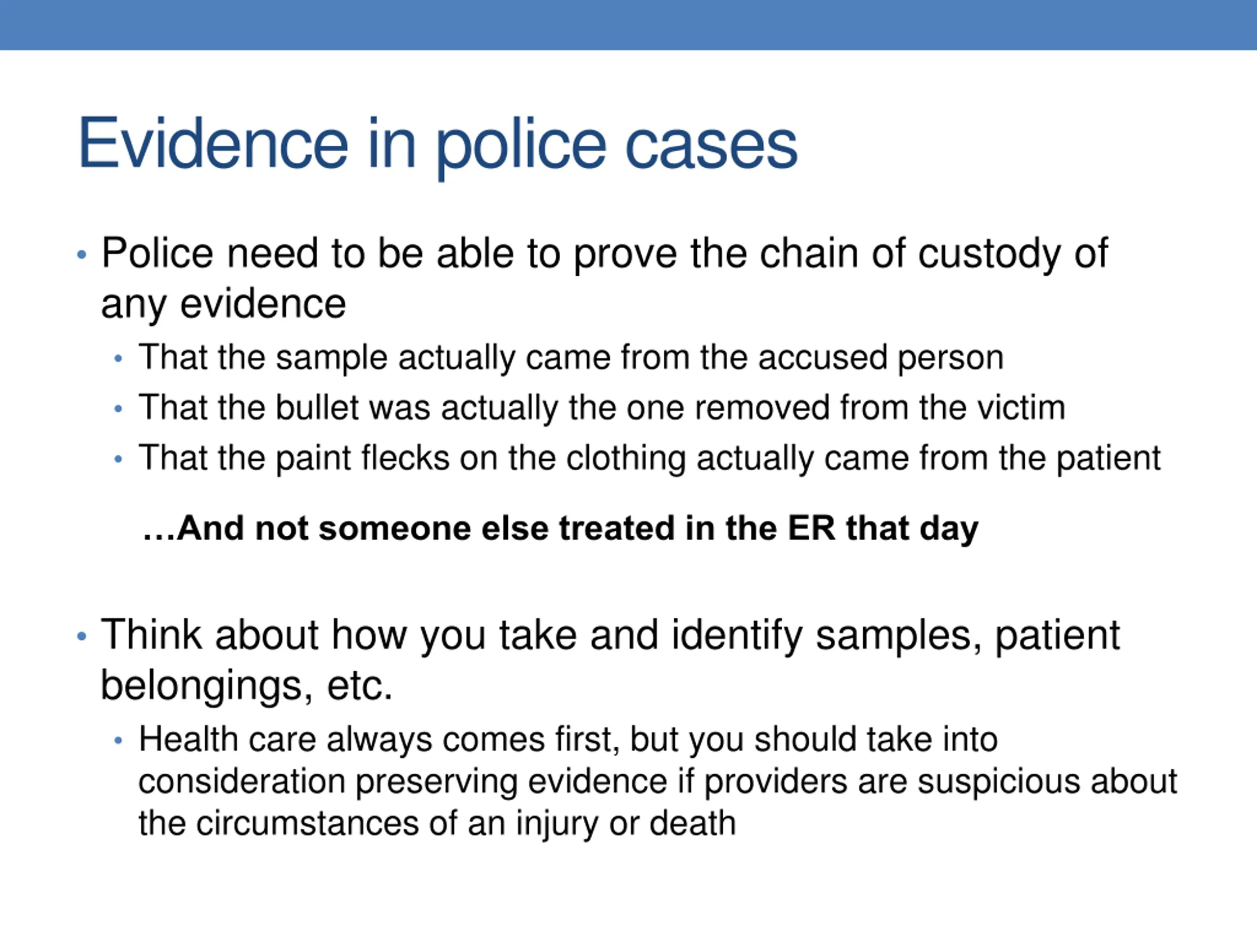 Evidence in police cases Police need to be able to prove the chain of custody of any evidence That the sample actually came from the accused person That the bullet was actually the one removed from the victim That the paint flecks on the clothing actually came from the patient And not someone else treated in the ER that day Think about how you take and identify samples, patient belongings, etc. Health care always comes first, but you should take into consideration preserving evidence if providers are suspicious about the circumstances of an injury or death