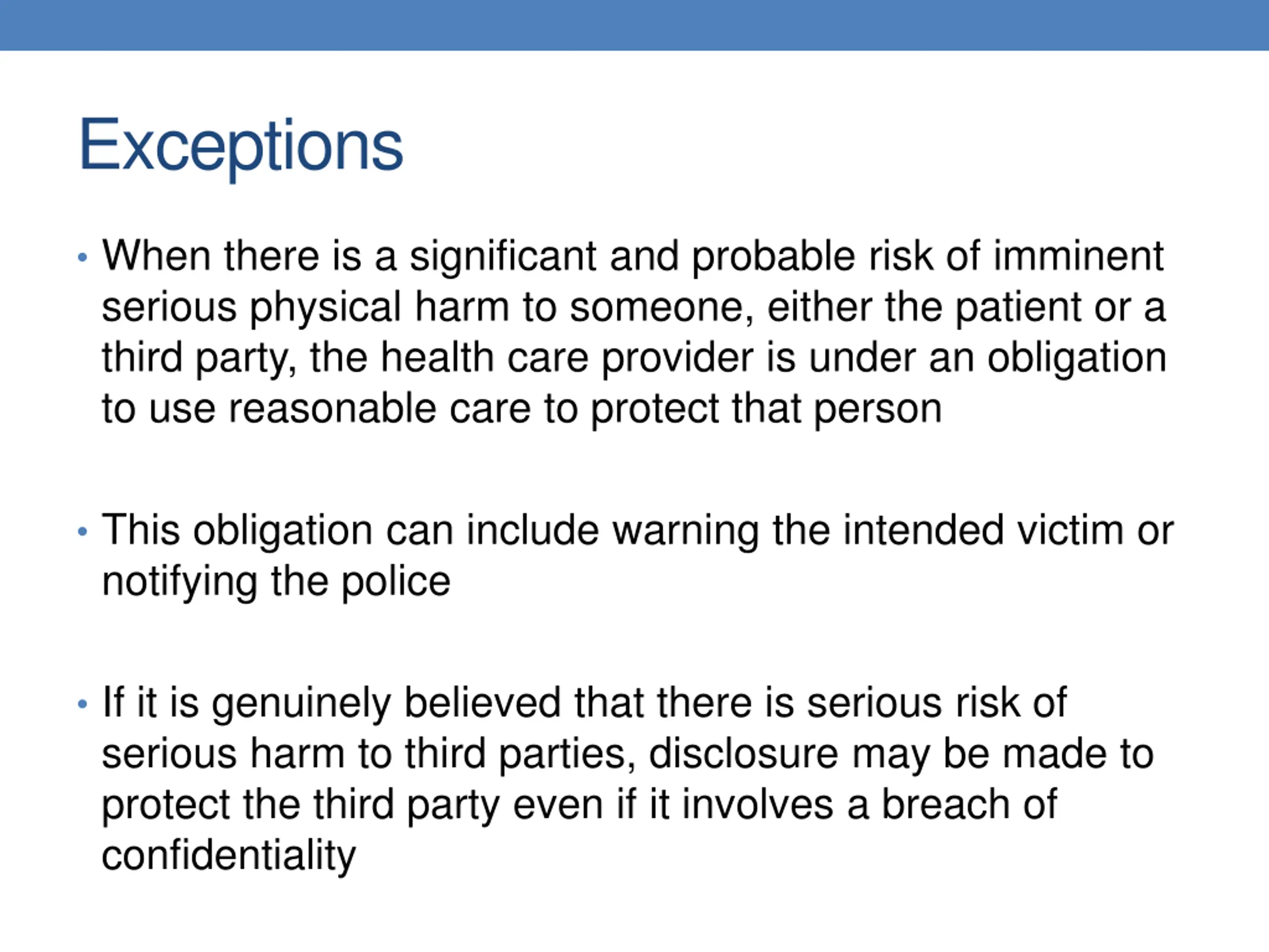 Exceptions When there is a significant and probable risk of imminent serious physical harm to someone, either the patient or a third party, the health care provider is under an obligation to use reasonable care to protect that person This obligation can include warning the intended victim or notifying the police If it is genuinely believed that there is serious risk of serious harm to third parties, disclosure may be made to protect the third party even if it involves a breach of confidentiality