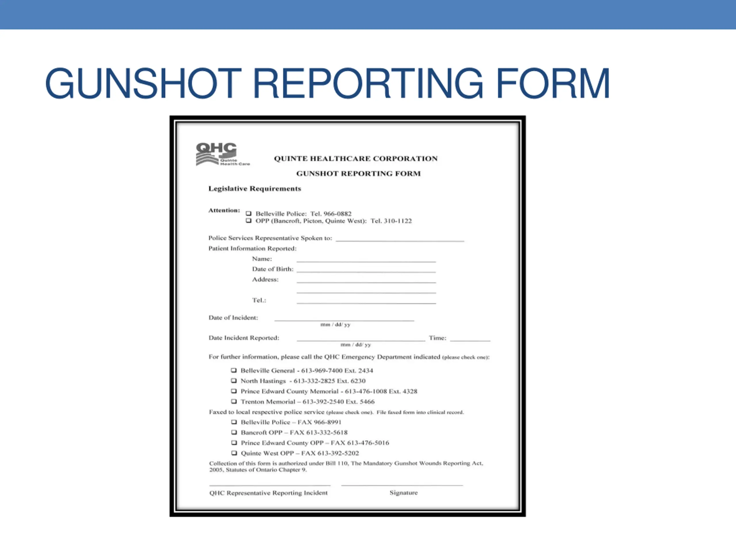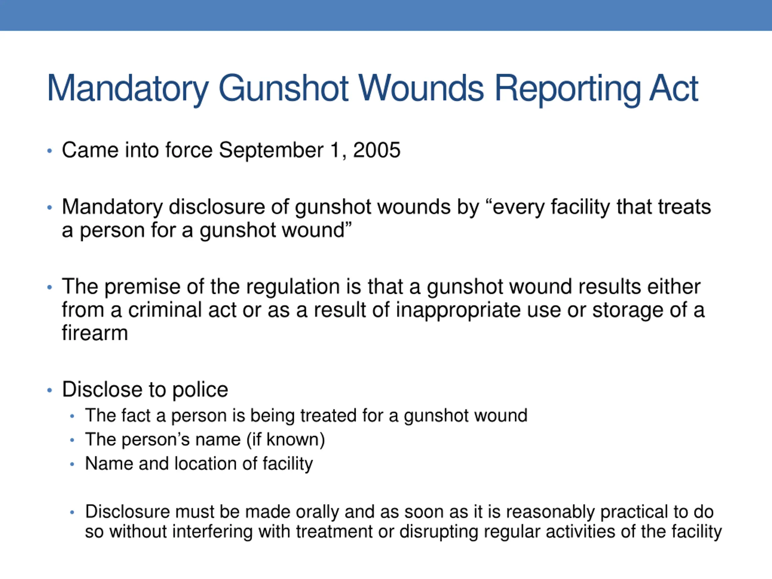 Mandatory Gunshot Wounds Reporting Act Came into force September 1, 2005 Mandatory disclosure of gunshot wounds by every facility that treats a person for a gunshot wound The premise of the regulation is that a gunshot wound results either from a criminal act or as a result of inappropriate use or storage of a firearm Disclose to police The fact a person is being treated for a gunshot wound The person s name (if known) Name and location of facility Disclosure must be made orally and as soon as it is reasonably practical to do so without interfering with treatment or disrupting regular activities of the facility