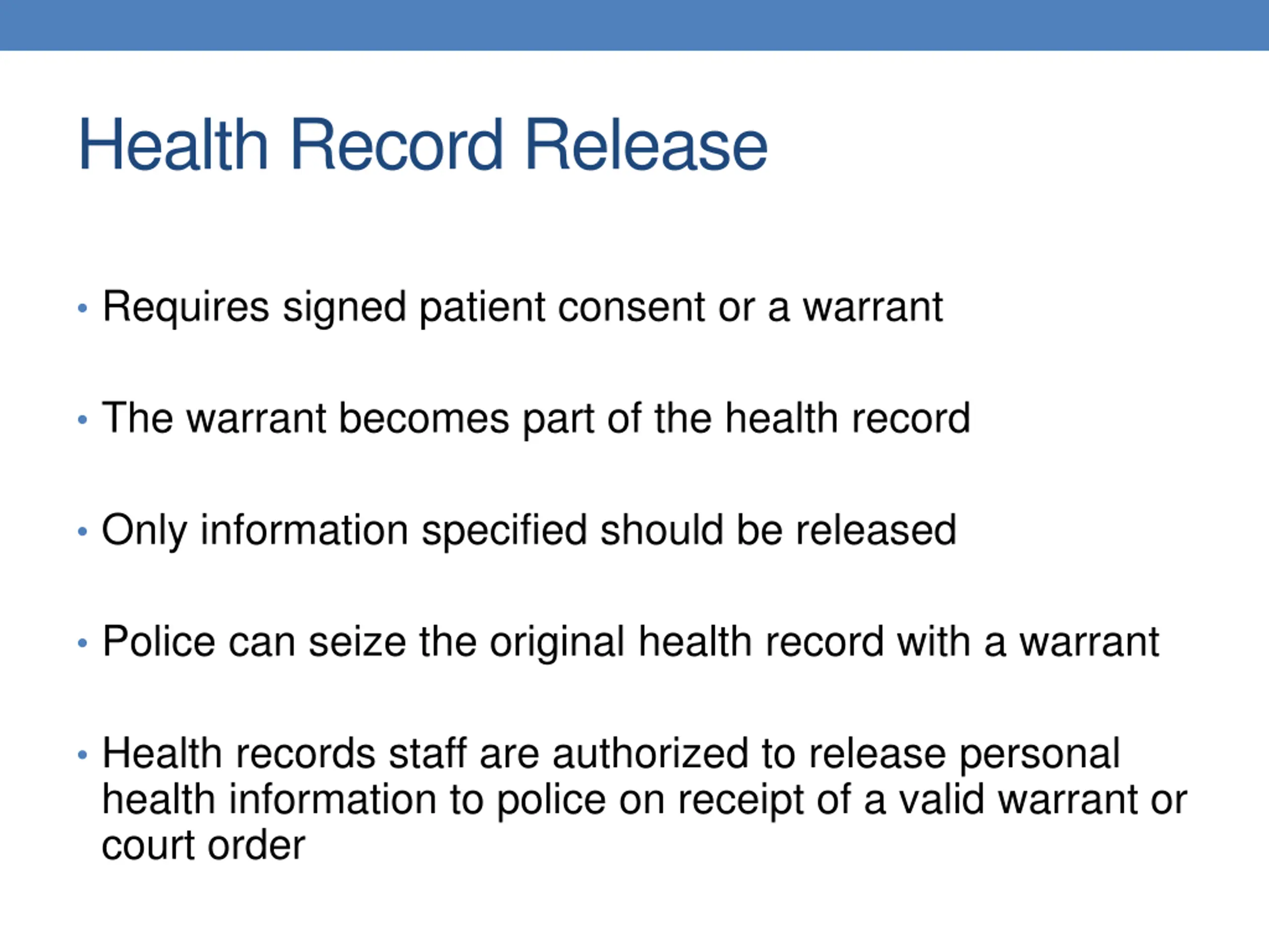 Health Record Release Requires signed patient consent or a warrant The warrant becomes part of the health record Only information specified should be released Police can seize the original health record with a warrant Health records staff are authorized to release personal health information to police on receipt of a valid warrant or court order