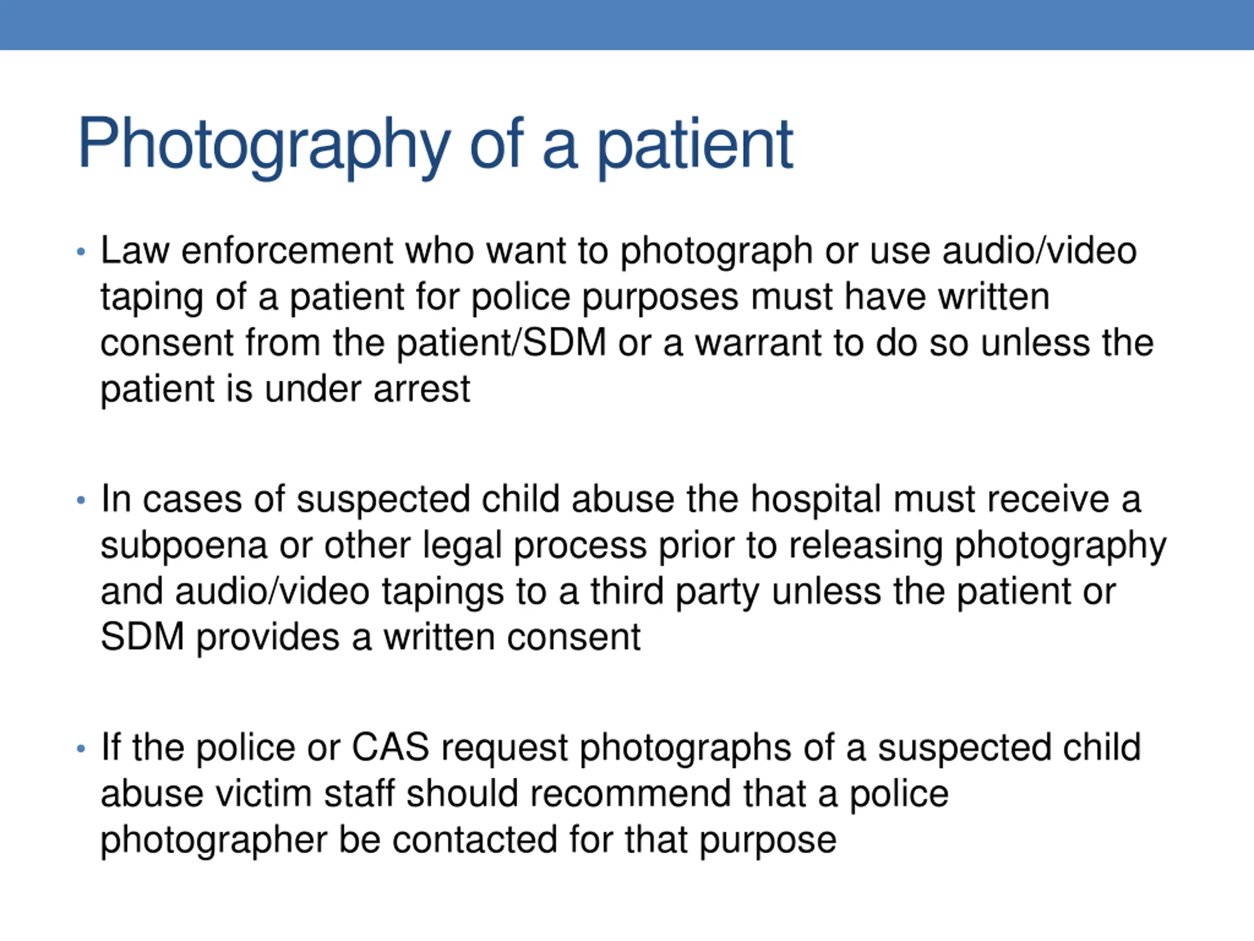Photography of a patient Law enforcement who want to photograph or use audio/video taping of a patient for police purposes must have written consent from the patient/SDM or a warrant to do so unless the patient is under arrest In cases of suspected child abuse the hospital must receive a subpoena or other legal process prior to releasing photography and audio/video tapings to a third party unless the patient or SDM provides a written consent If the police or CAS request photographs of a suspected child abuse victim staff should recommend that a police photographer be contacted for that purpose