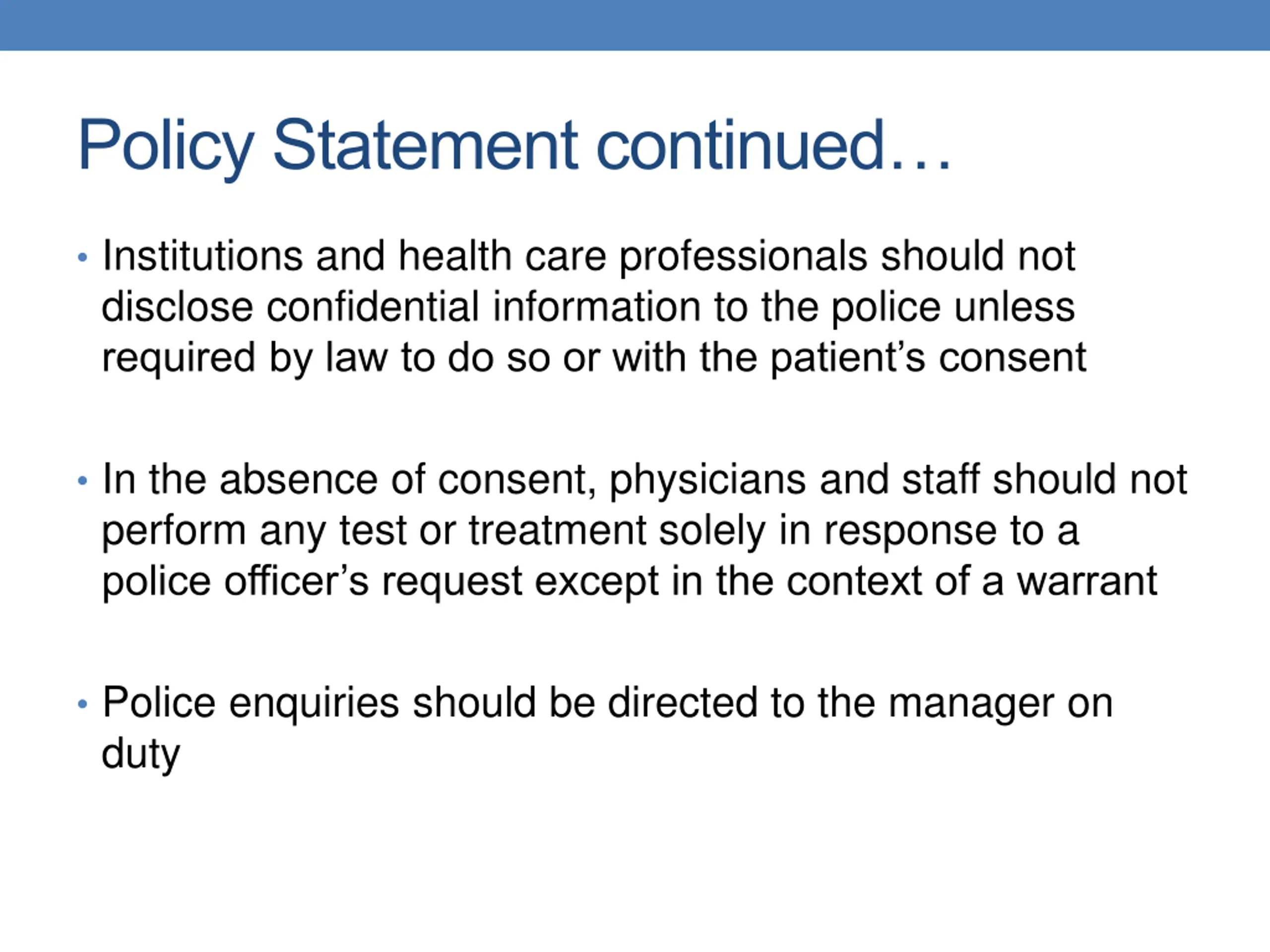 Policy Statement continued Institutions and health care professionals should not disclose confidential information to the police unless required by law to do so or with the patient s consent In the absence of consent, physicians and staff should not perform any test or treatment solely in response to a police officer s request except in the context of a warrant Police enquiries should be directed to the manager on duty