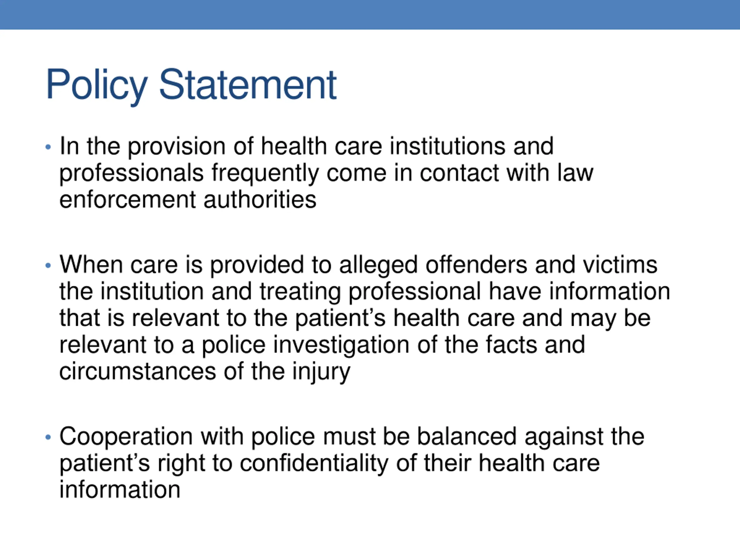 Policy Statement In the provision of health care institutions and professionals frequently come in contact with law enforcement authorities When care is provided to alleged offenders and victims the institution and treating professional have information that is relevant to the patient s health care and may be relevant to a police investigation of the facts and circumstances of the injury Cooperation with police must be balanced against the patient s right to confidentiality of their health care information