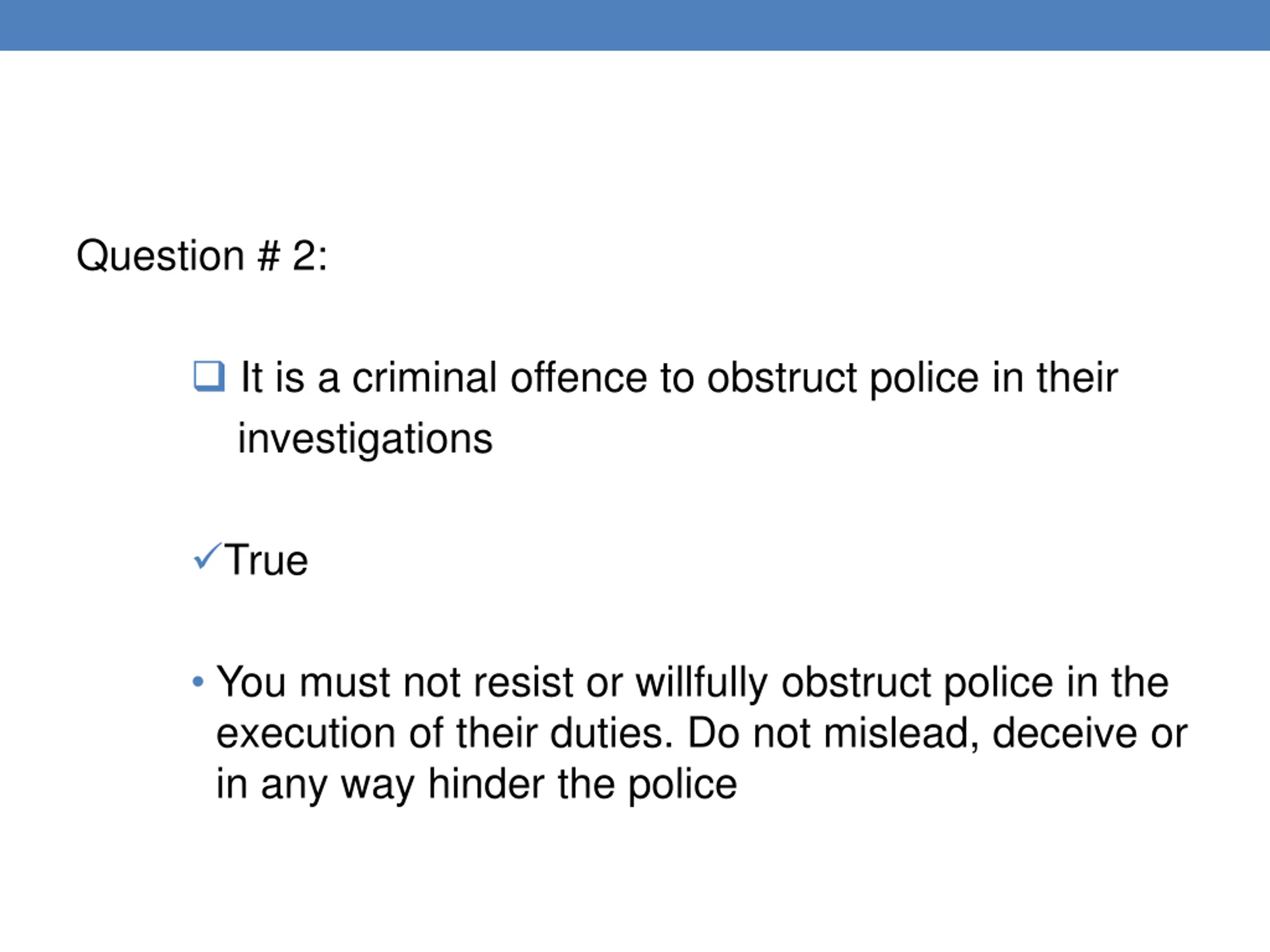Question # 2: It is a criminal offence to obstruct police in their investigations True You must not resist or willfully obstruct police in the execution of their duties. Do not mislead, deceive or in any way hinder the police