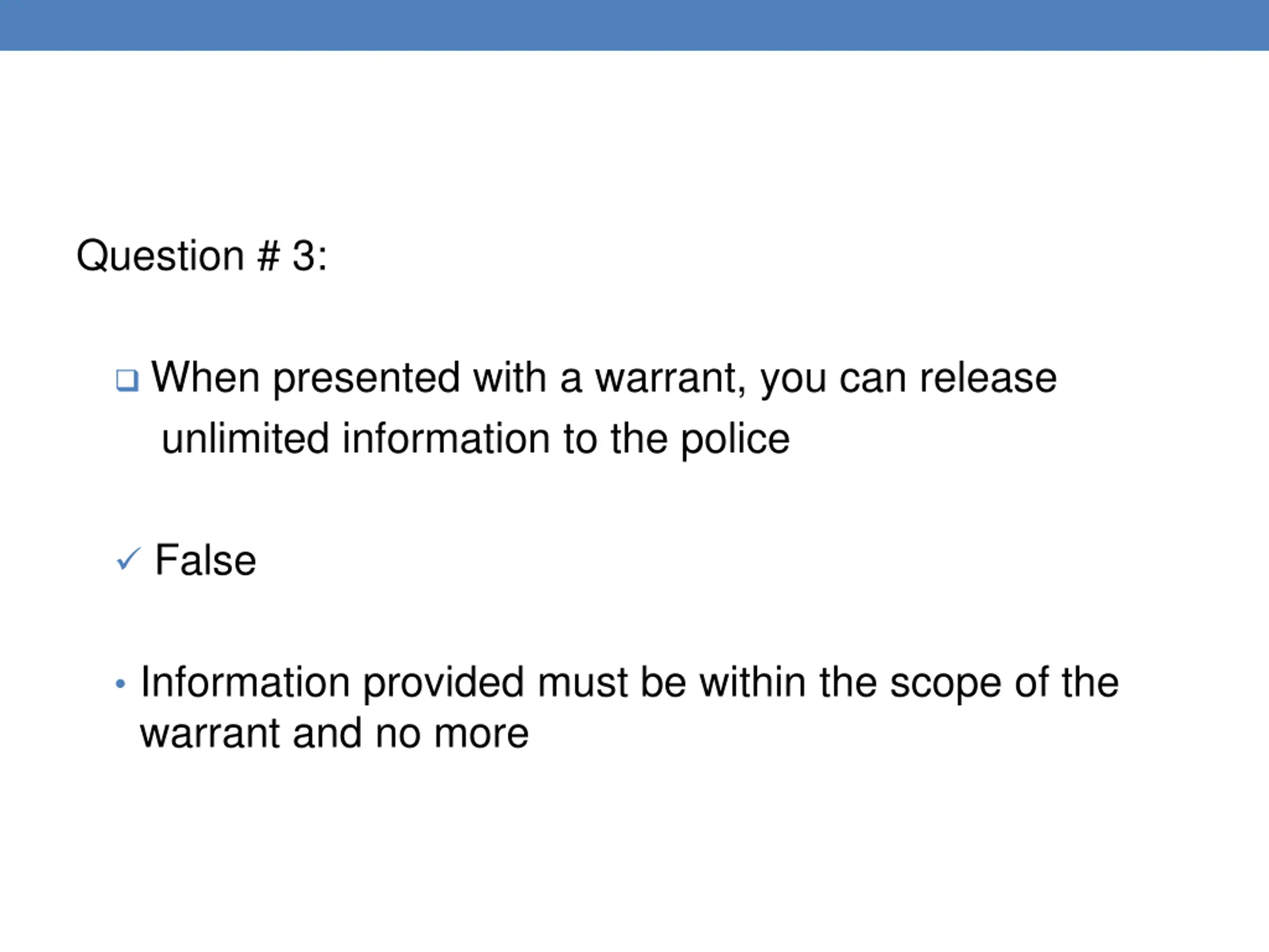 Question # 3: When presented with a warrant, you can release unlimited information to the police False Information provided must be within the scope of the warrant and no more