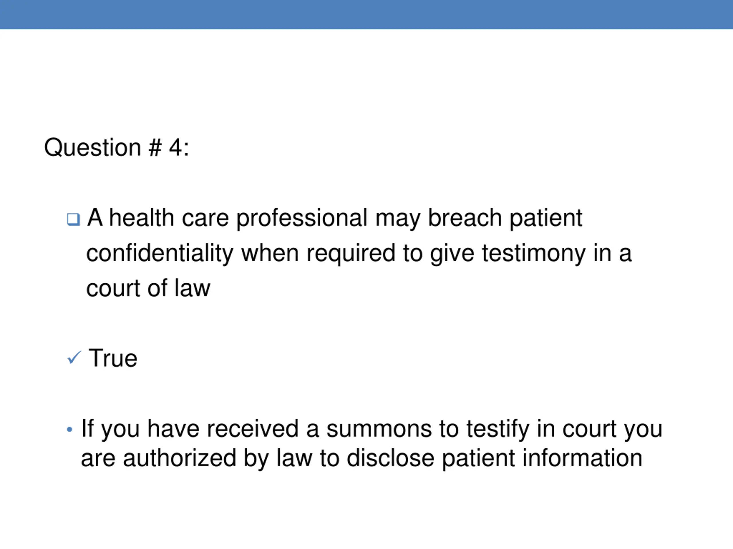 Question # 4: A health care professional may breach patient confidentiality when required to give testimony in a court of law True If you have received a summons to testify in court you are authorized by law to disclose patient information