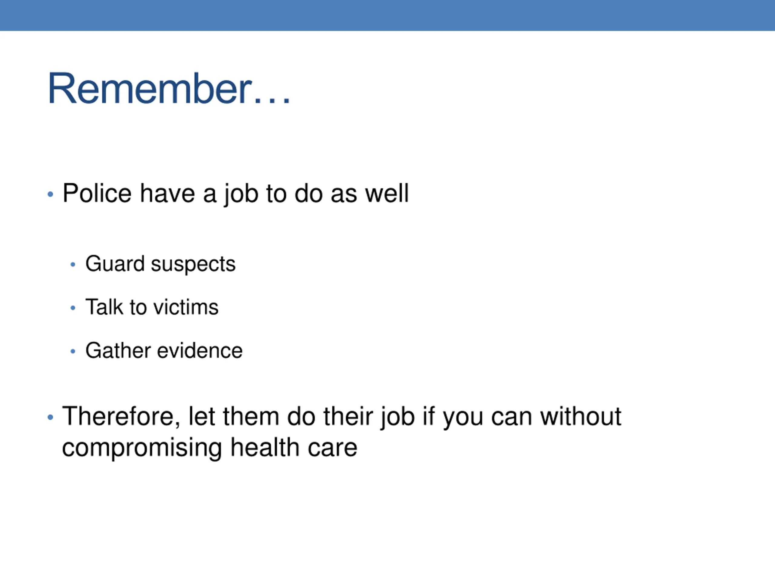 Remember Police have a job to do as well Guard suspects Talk to victims Gather evidence Therefore, let them do their job if you can without compromising health care