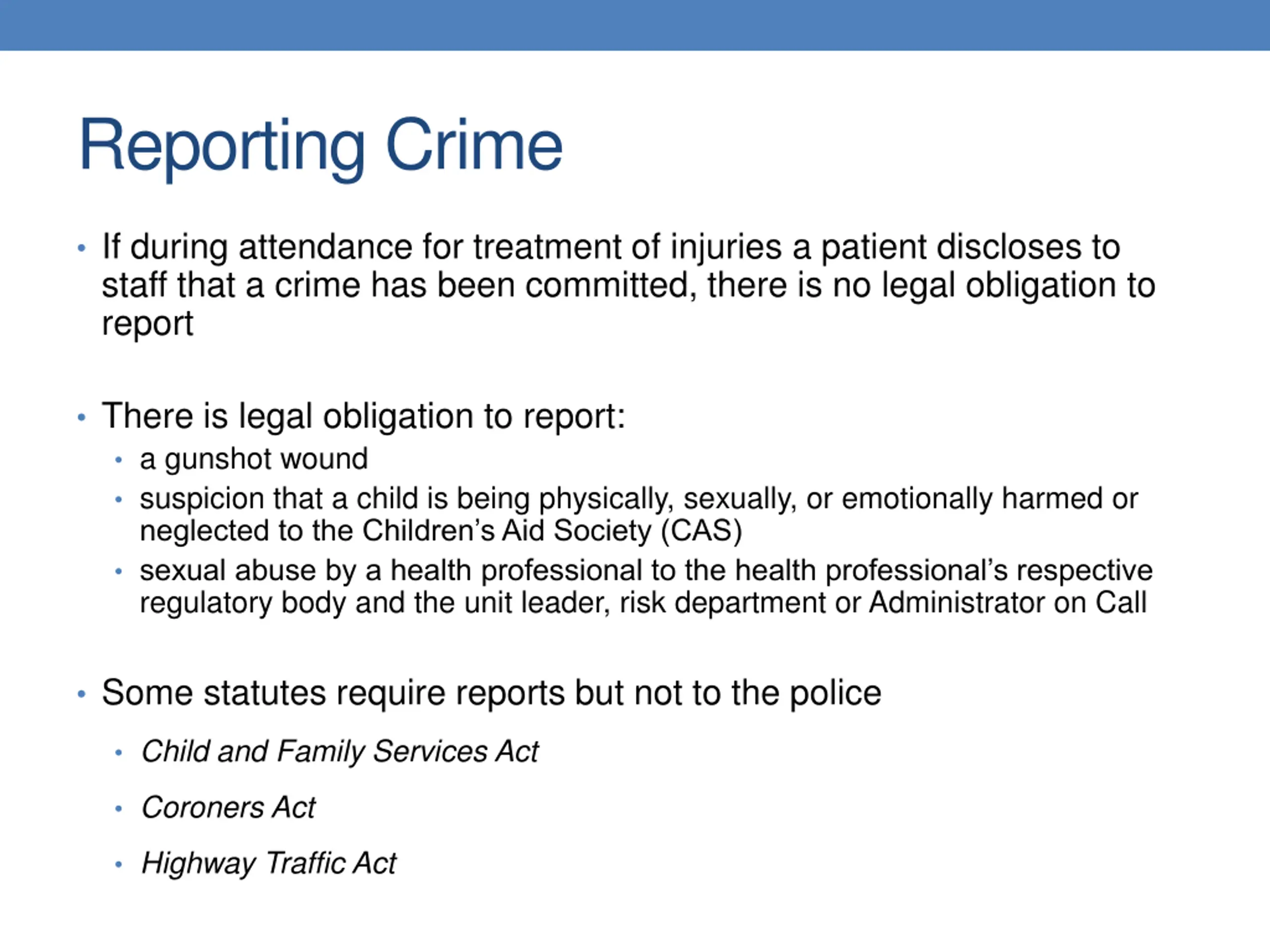 Reporting Crime If during attendance for treatment of injuries a patient discloses to staff that a crime has been committed, there is no legal obligation to report There is legal obligation to report: a gunshot wound suspicion that a child is being physically, sexually, or emotionally harmed or neglected to the Children s Aid Society (CAS) sexual abuse by a health professional to the health professional s respective regulatory body and the unit leader, risk department or Administrator on Call Some statutes require reports but not to the police Child and Family Services Act Coroners Act Highway Traffic Act