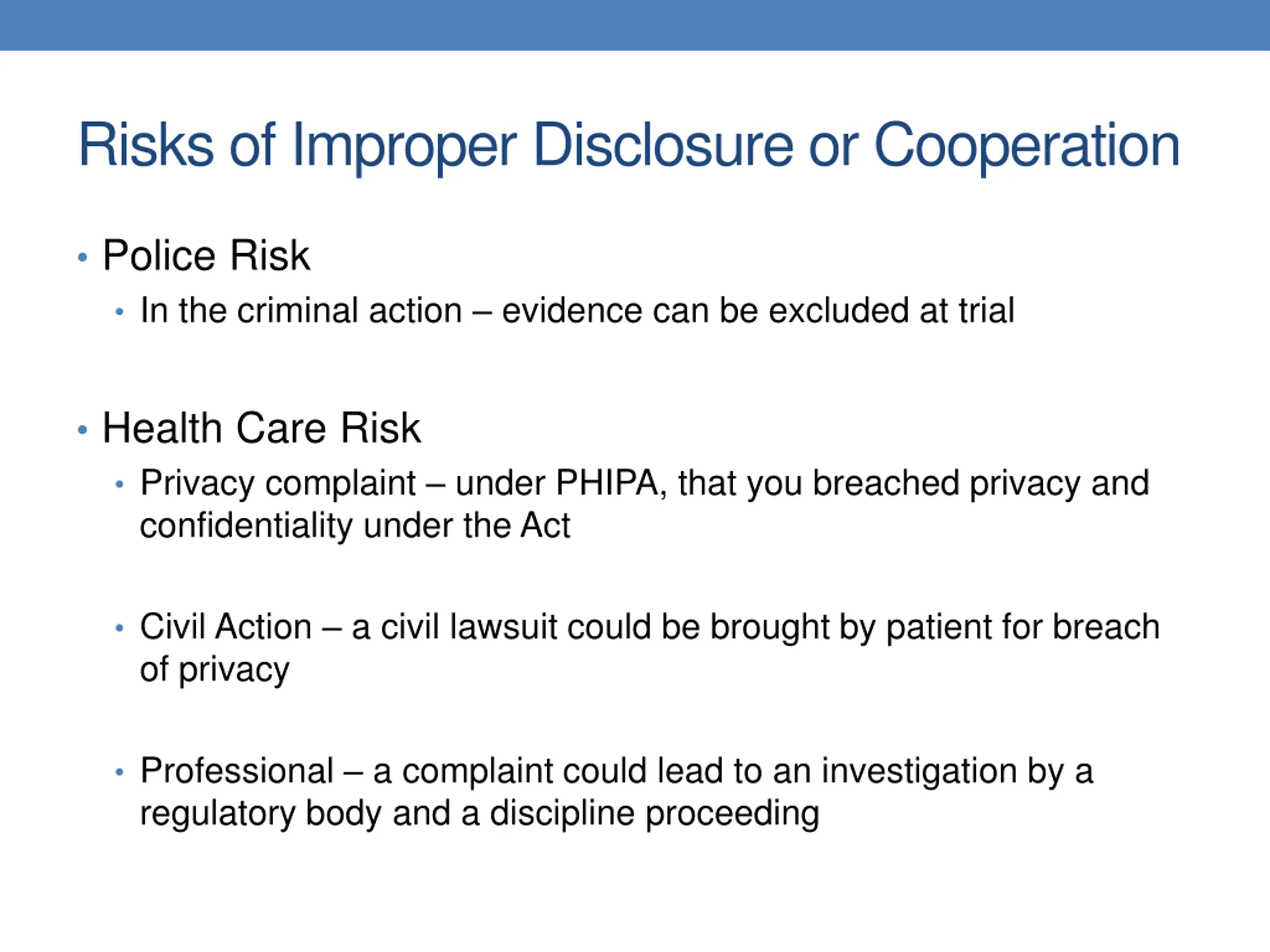 Risks of Improper Disclosure or Cooperation Police Risk In the criminal action evidence can be excluded at trial Health Care Risk Privacy complaint under PHIPA, that you breached privacy and confidentiality under the Act Civil Action a civil lawsuit could be brought by patient for breach of privacy Professional a complaint could lead to an investigation by a regulatory body and a discipline proceeding