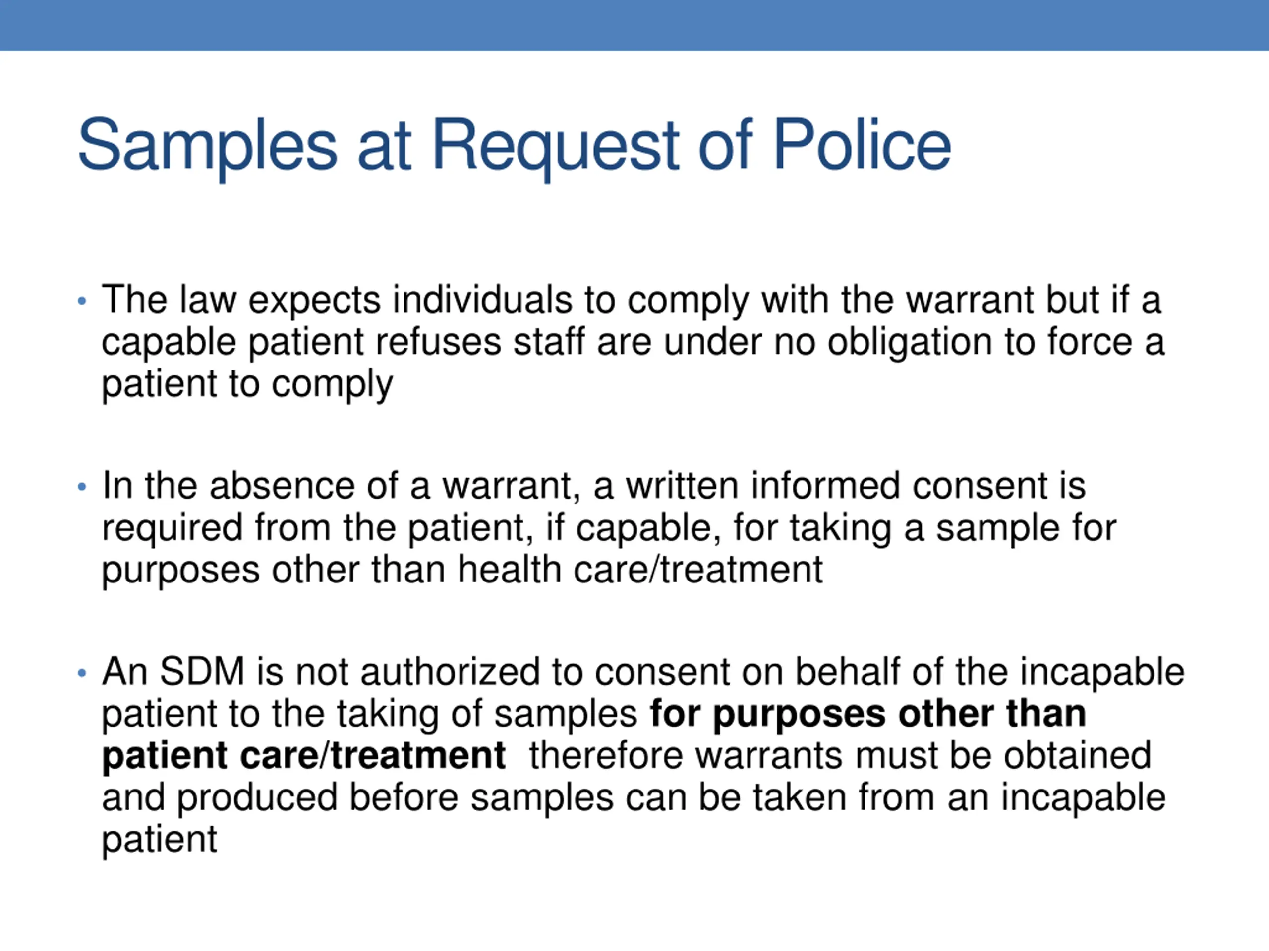 Samples at Request of Police The law expects individuals to comply with the warrant but if a capable patient refuses staff are under no obligation to force a patient to comply In the absence of a warrant, a written informed consent is required from the patient, if capable, for taking a sample for purposes other than health care/treatment An SDM is not authorized to consent on behalf of the incapable patient to the taking of samples for purposes other than patient care/treatment therefore warrants must be obtained and produced before samples can be taken from an incapable patient