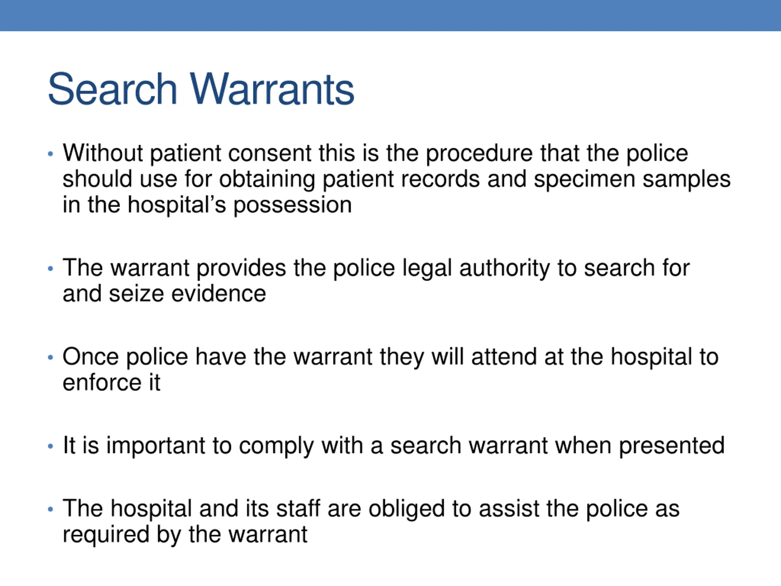 Search Warrants Without patient consent this is the procedure that the police should use for obtaining patient records and specimen samples in the hospital s possession The warrant provides the police legal authority to search for and seize evidence Once police have the warrant they will attend at the hospital to enforce it It is important to comply with a search warrant when presented The hospital and its staff are obliged to assist the police as required by the warrant