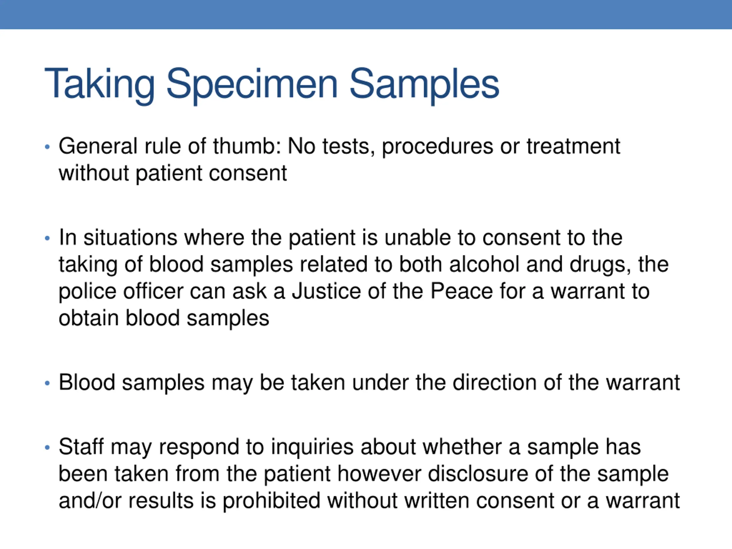 Taking Specimen Samples General rule of thumb: No tests, procedures or treatment without patient consent In situations where the patient is unable to consent to the taking of blood samples related to both alcohol and drugs, the police officer can ask a Justice of the Peace for a warrant to obtain blood samples Blood samples may be taken under the direction of the warrant Staff may respond to inquiries about whether a sample has been taken from the patient however disclosure of the sample and/or results is prohibited without written consent or a warrant
