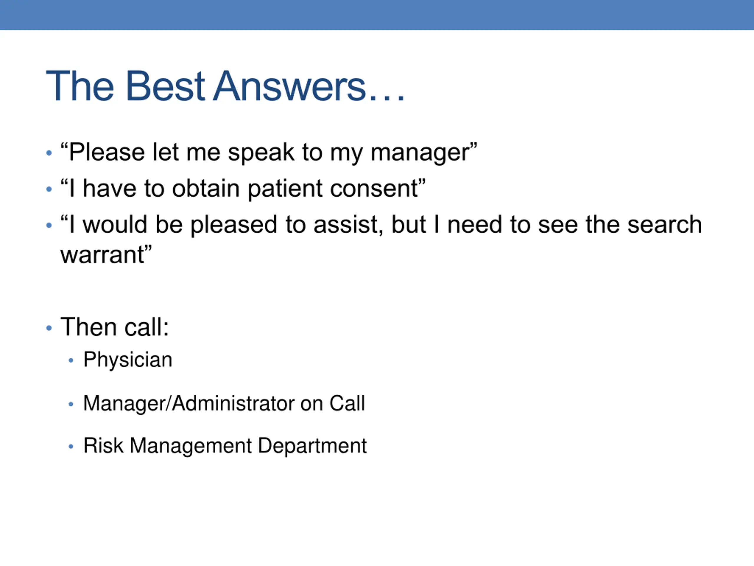 The Best Answers Please let me speak to my manager I have to obtain patient consent I would be pleased to assist, but I need to see the search warrant Then call: Physician Manager/Administrator on Call Risk Management Department