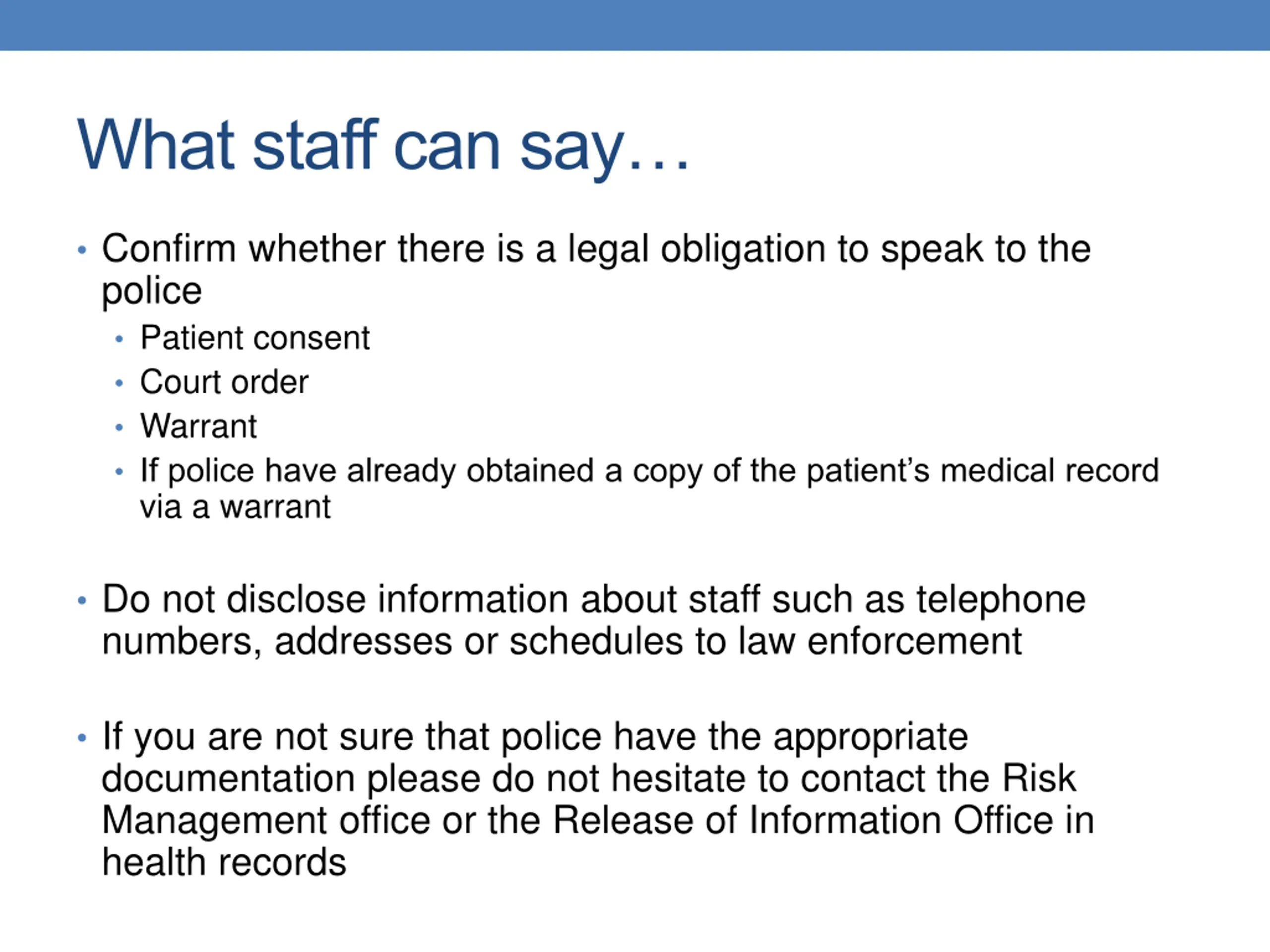What staff can say Confirm whether there is a legal obligation to speak to the police Patient consent Court order Warrant If police have already obtained a copy of the patient s medical record via a warrant Do not disclose information about staff such as telephone numbers, addresses or schedules to law enforcement If you are not sure that police have the appropriate documentation please do not hesitate to contact the Risk Management office or the Release of Information Office in health records