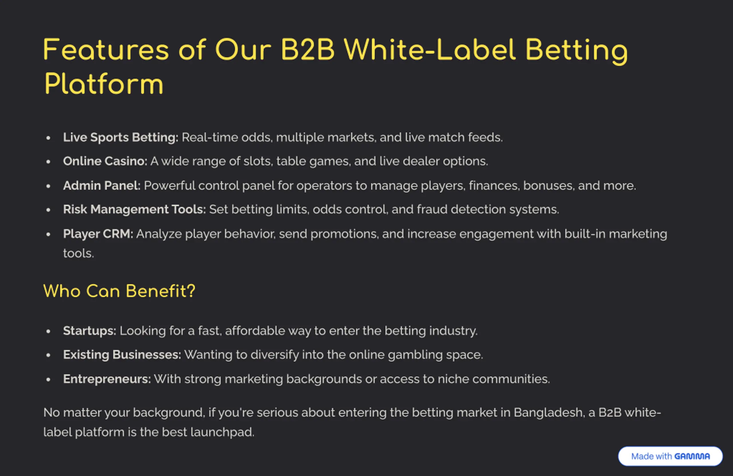 Feae f O B2B Wmpe-Labe Bepg P a f Live Sports Betting: Rpa - p jj , p a p , a j p a c ppj . Online Casino: A jp a p , ab p a p , a j p jpa p . Admin Panel: P p c a p p a a a p a p , a cp , b p , a j p. Risk Management Tools: Sp bp , jj c , a j a j jp pc p . Player CRM: A a p a p bp a , p j , a j c pa p p a p p b - a p . Wm Ca Be efp ? Startups: L a a , a jab p a p p p bp j . Existing Businesses: Wa j p p p a b acp. Entrepreneurs: W a p bac j accp c p c p . N a p bac j, ' p p ab p p p bp a p Ba ajp , a B2B p- abp a p bp a c aj.