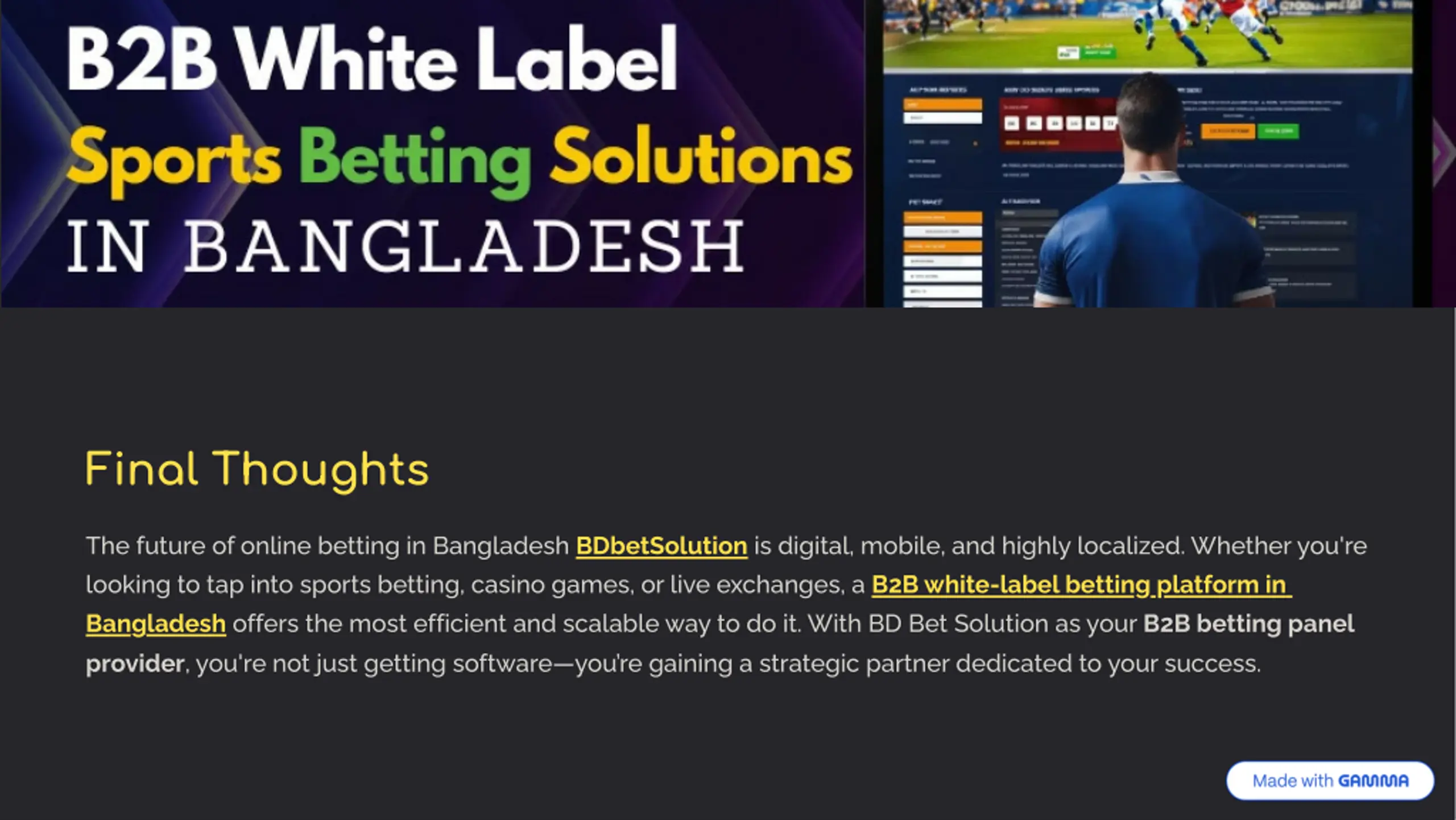 Final Thoughts T p p p bp Ba ajp BDbetSolution j a , b p, a j ca pj. W p p ' p a bp , ca a p , p p c a p , a B2B white-label betting platform in Bangladesh p p p c p a j ca ab p a j . W BD Bp S a B2B betting panel provider, ' p p a p4 9 p a a a p c a p jpj ca pj ccp .