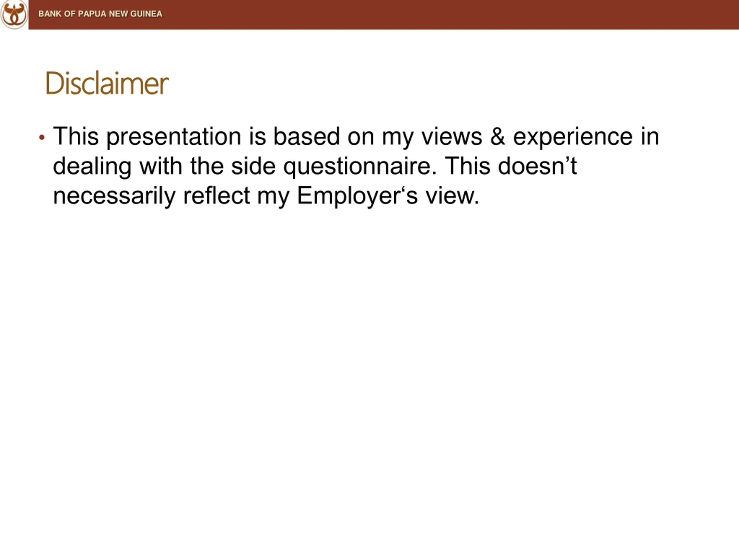 BANK OF PAPUA NEW GUINEA Disclaimer Disclaimer This presentation is based on my views & experience in dealing with the side questionnaire. This doesn t necessarily reflect my Employer s view.