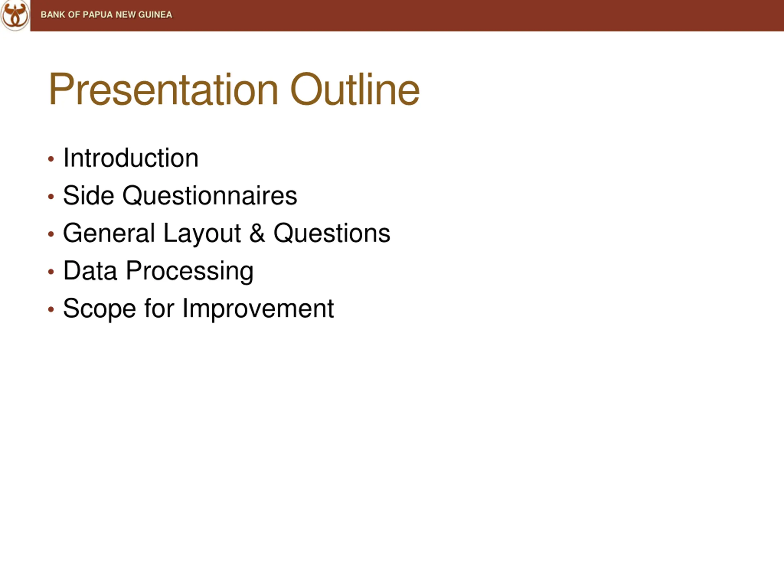 BANK OF PAPUA NEW GUINEA Presentation Outline Introduction Side Questionnaires General Layout & Questions Data Processing Scope for Improvement