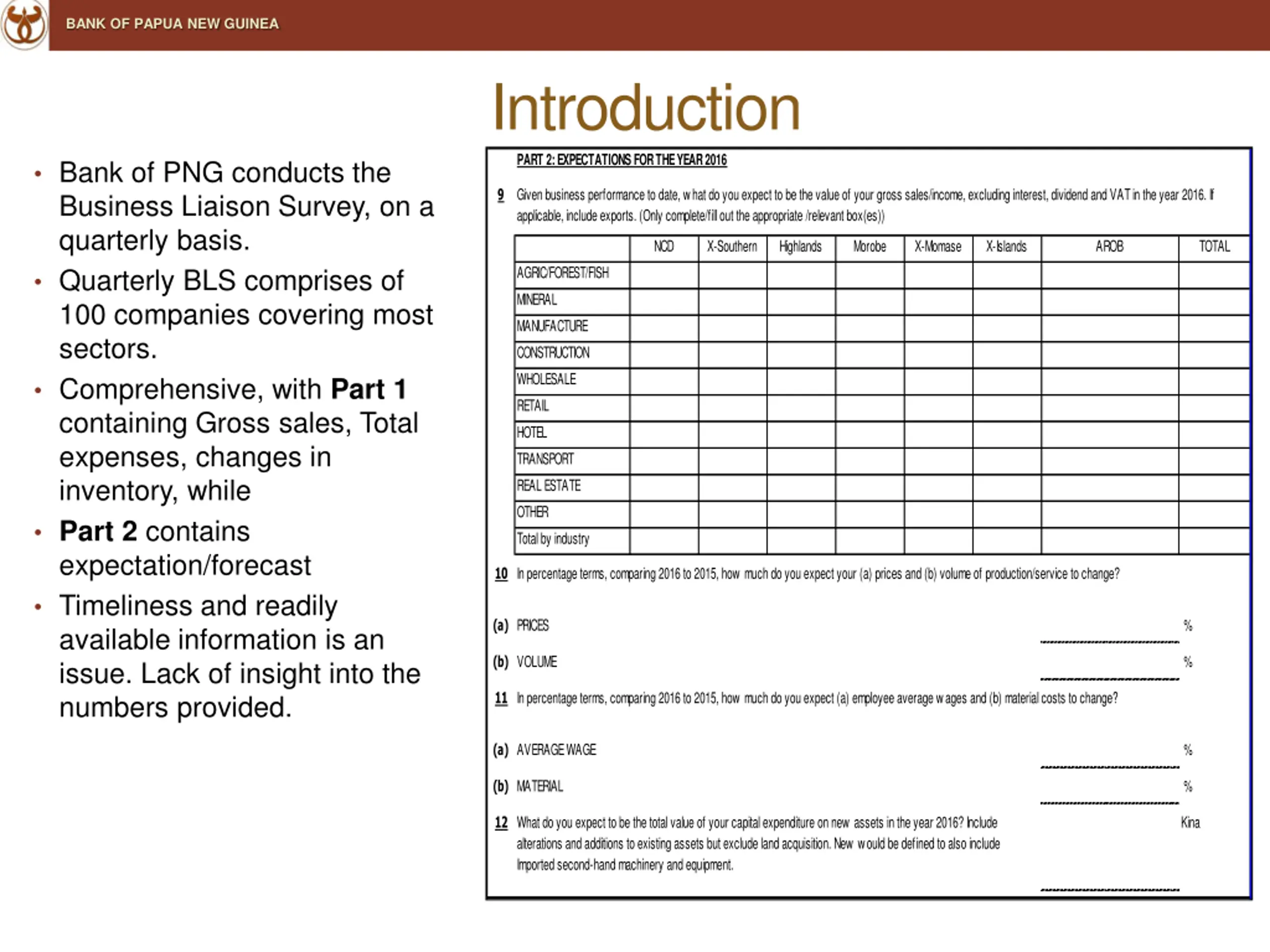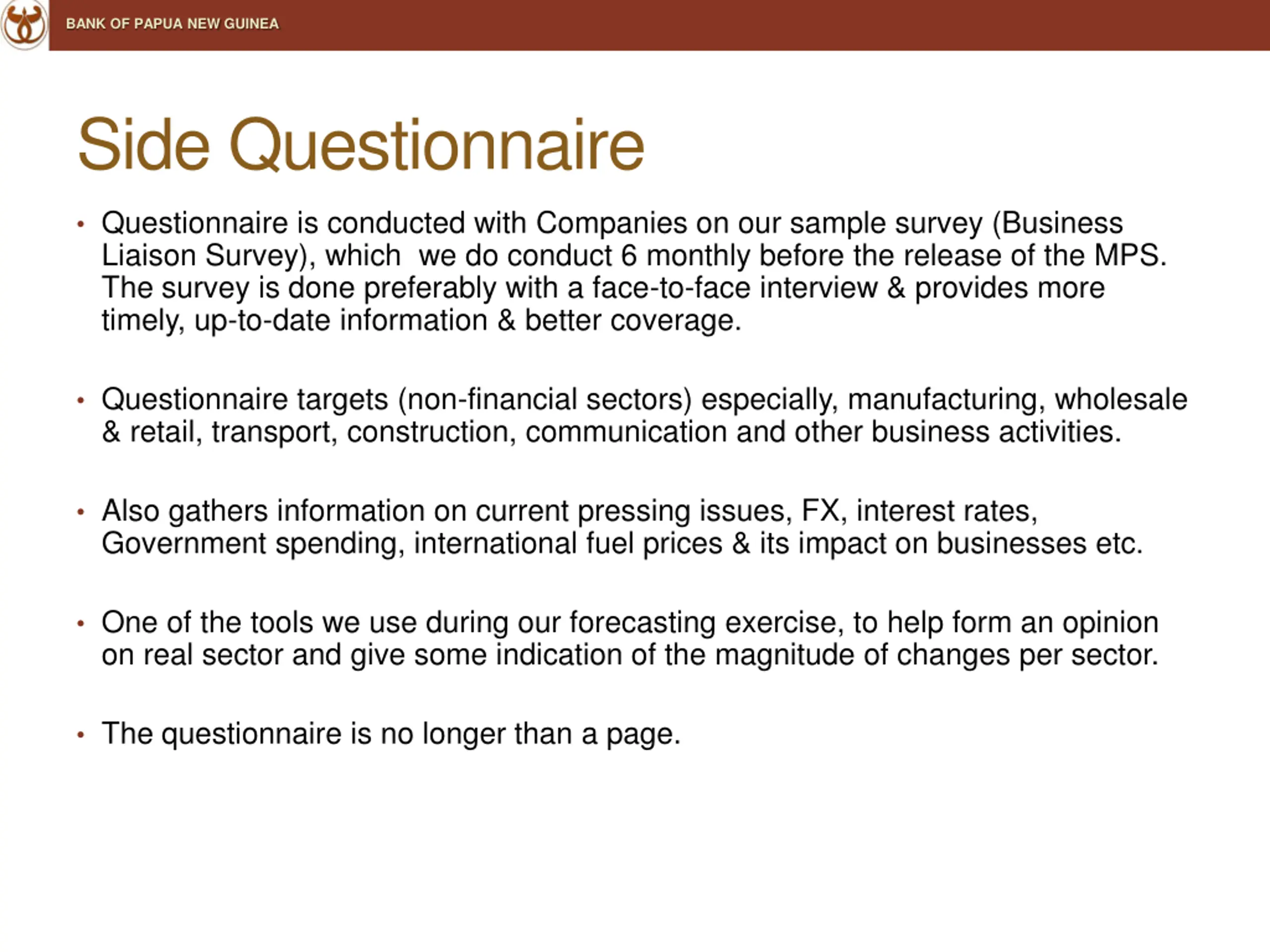 BANK OF PAPUA NEW GUINEA Side Questionnaire Questionnaire is conducted with Companies on our sample survey (Business Liaison Survey), which we do conduct 6 monthly before the release of the MPS. The survey is done preferably with a face-to-face interview & provides more timely, up-to-date information & better coverage. Questionnaire targets (non-financial sectors) especially, manufacturing, wholesale & retail, transport, construction, communication and other business activities. Also gathers information on current pressing issues, FX, interest rates, Government spending, international fuel prices & its impact on businesses etc. One of the tools we use during our forecasting exercise, to help form an opinion on real sector and give some indication of the magnitude of changes per sector. The questionnaire is no longer than a page.
