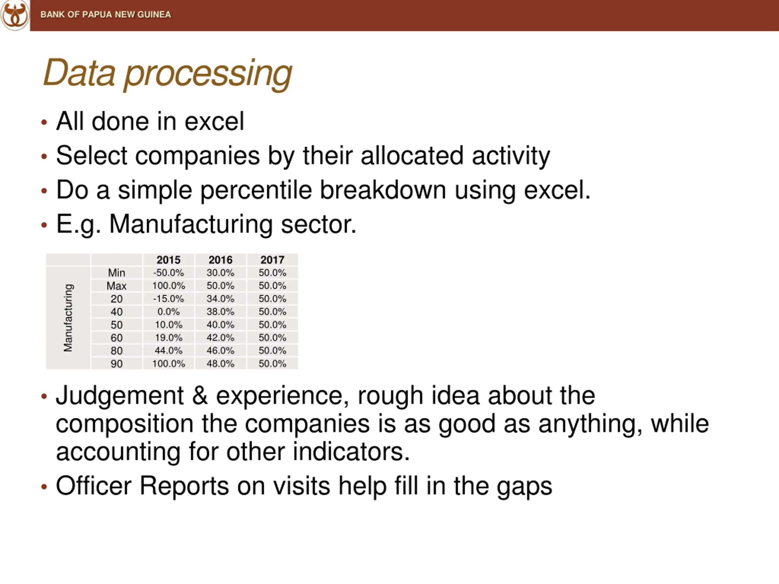 BANK OF PAPUA NEW GUINEA Data processing All done in excel Select companies by their allocated activity Do a simple percentile breakdown using excel. E.g. Manufacturing sector. 2015 -50.0% 100.0% -15.0% 0.0% 10.0% 19.0% 44.0% 100.0% 2016 30.0% 50.0% 34.0% 38.0% 40.0% 42.0% 46.0% 48.0% 2017 50.0% 50.0% 50.0% 50.0% 50.0% 50.0% 50.0% 50.0% Min Max 20 40 50 60 80 90 Manufacturing Judgement & experience, rough idea about the composition the companies is as good as anything, while accounting for other indicators. Officer Reports on visits help fill in the gaps